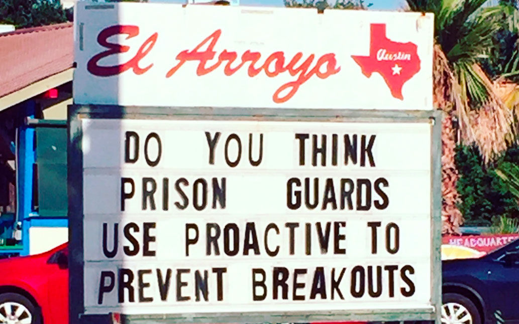 Das El Arroyo, ein TexMex Restaurant in Austin, ist mir nicht kulinarisch aufgefallen, denn ich war dort nie essen. Es fiel mir durch den Spruch des Tages auf der Werbetafel auf. Denn der Werbespruch wechselt täglich und die Macher sind wirklich sehr kreativ.