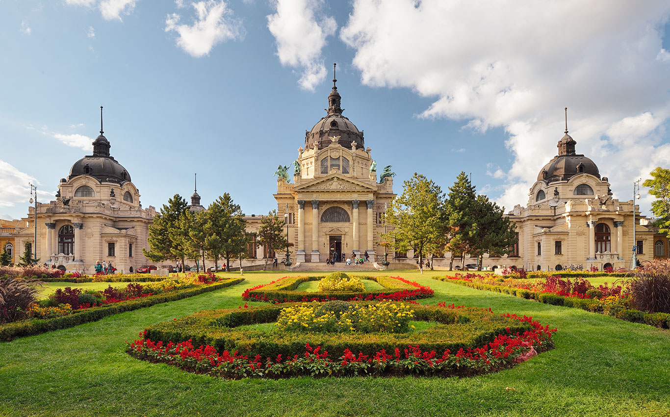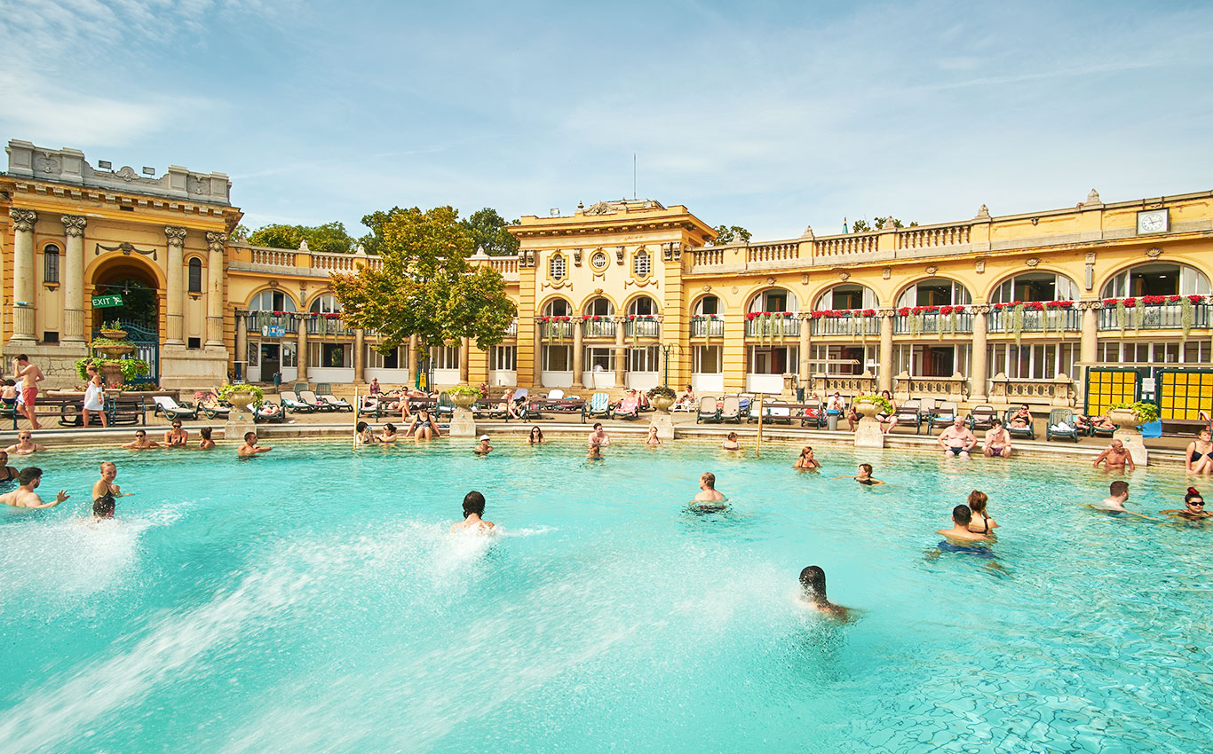 Direkt dahinter befindet sich eines der schönsten Bäder Budapests: Das Széchenyi Heilbad – ein Freibad im neobarocken Stil.