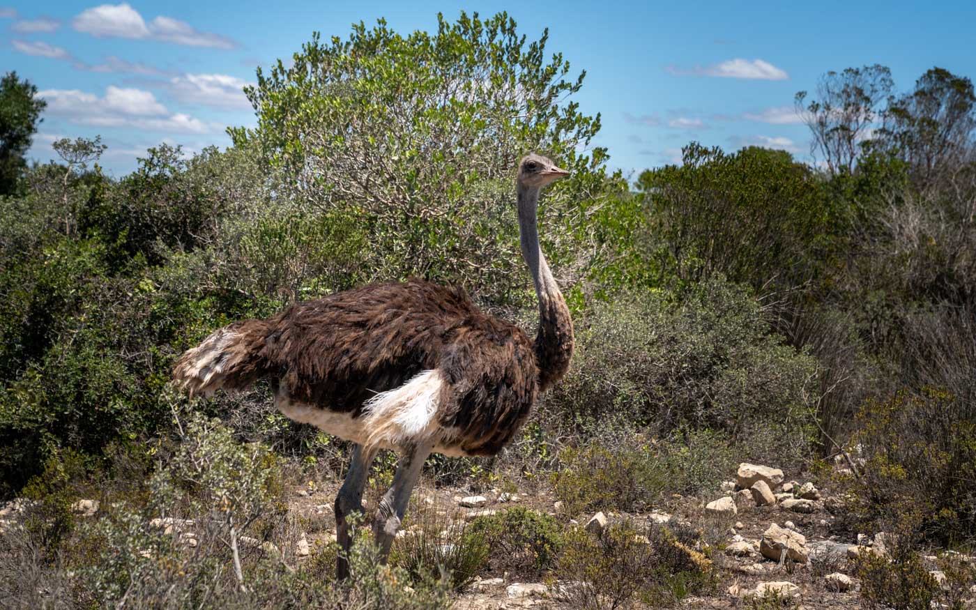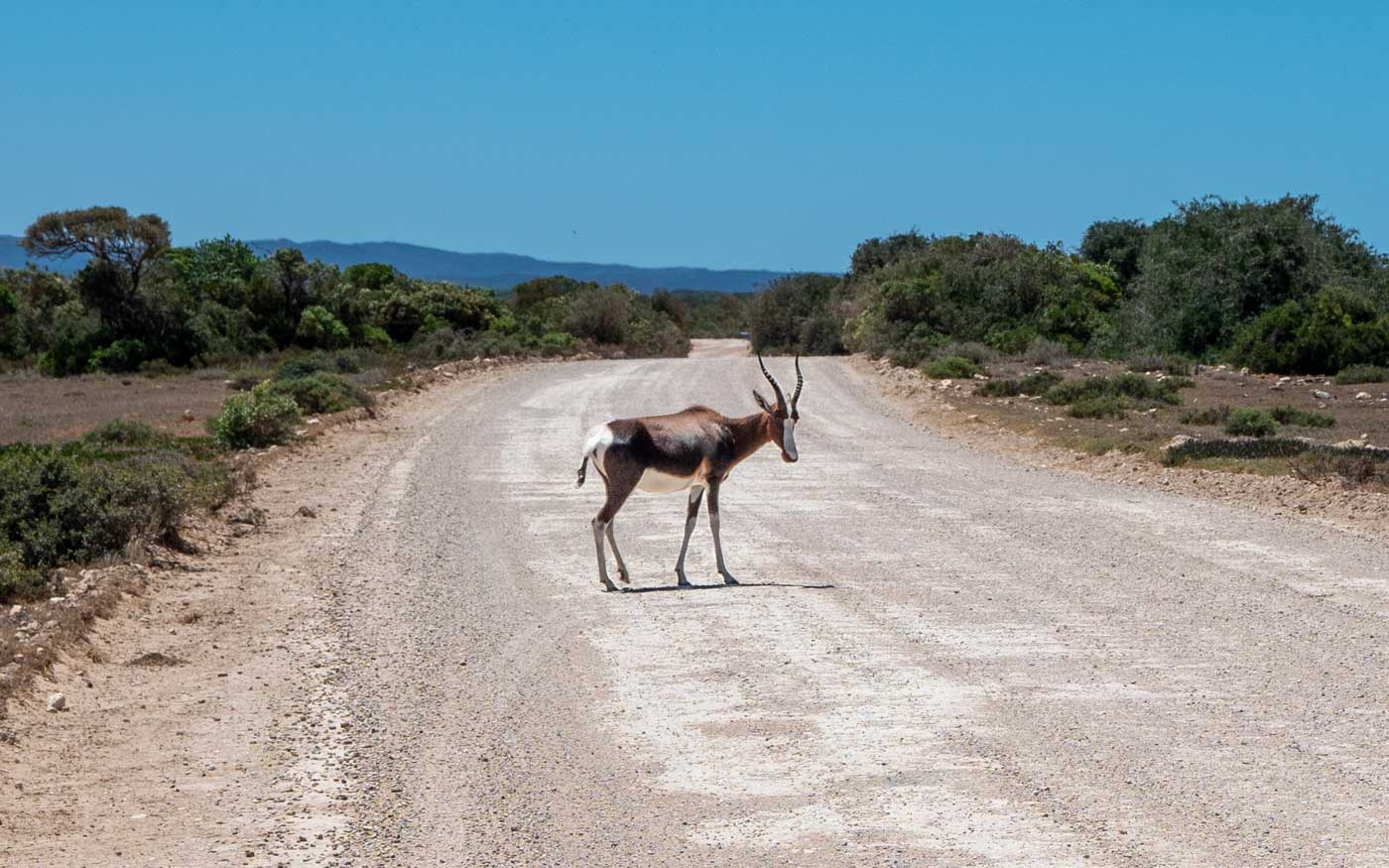 Im Naturschutzgebiet siehst du neben Straußen auch Bontebock (Buntbock), Kap-Bergzebras, Eland, Grauer Rehbock, Paviane und Gelbmangusten. De Hoop ist auch die Heimat des scheuen Karakals und des Leoparden. Ich habe allerdings noch niemand gesprochen, der hier einen Leoparden gesehen hat.