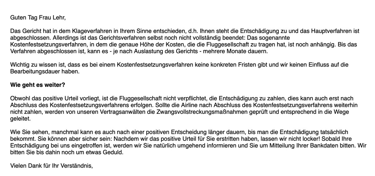 Das war meine Mail zur erfolgreichen Klage vor Gericht. Leider waren bei Flightright die Gebühren dafür so hoch, dass ich nur noch 125 Euro erhalten habe. Bei Claim Flights wäre es mehr gewesen. Schade, aber jetzt bin ich schlauer, kenne meine Rechte und weiß, dass ich beim nächsten Mal nicht mehr bei Flightright meine Fluggastrechte durchsetzen werde: