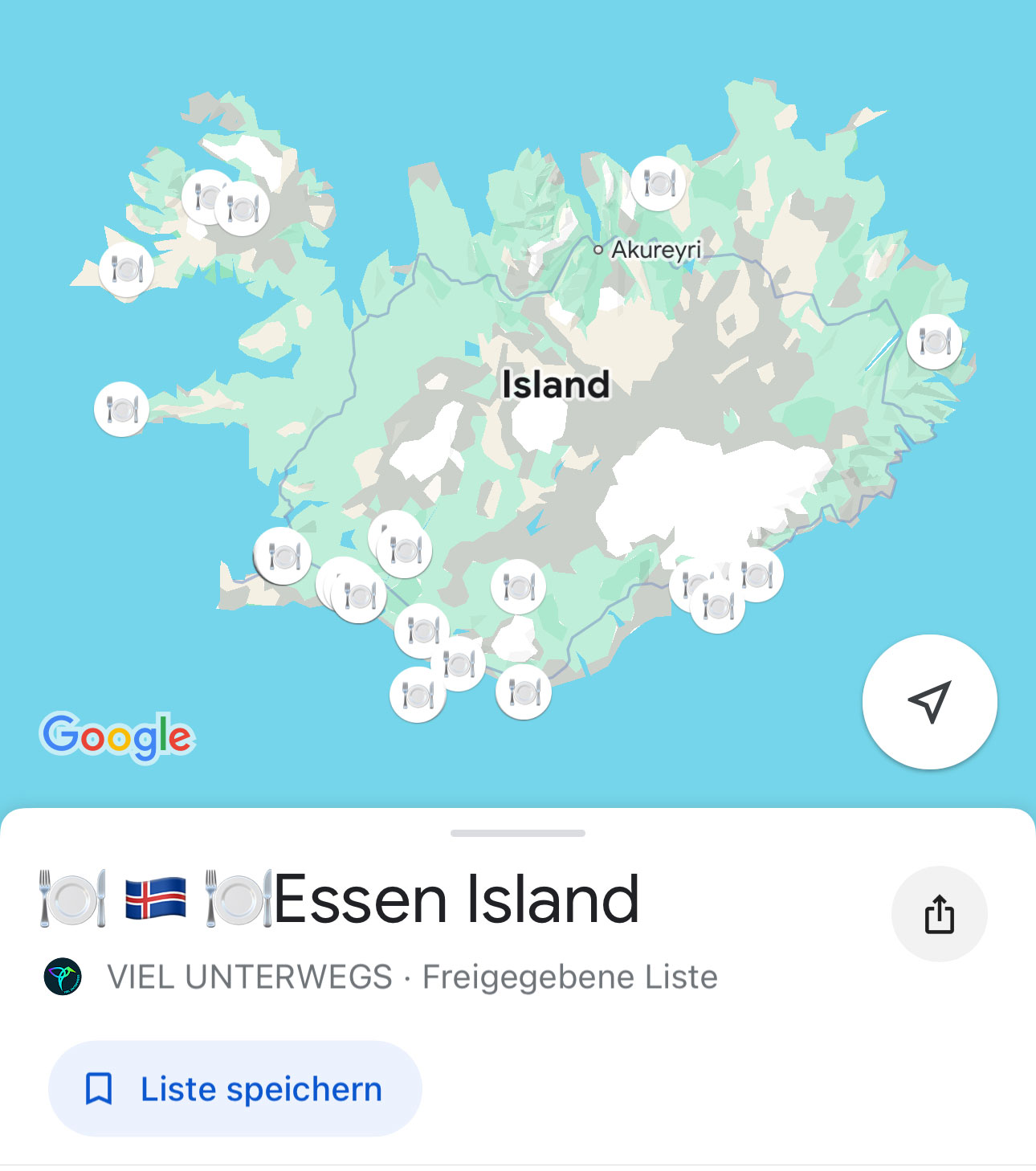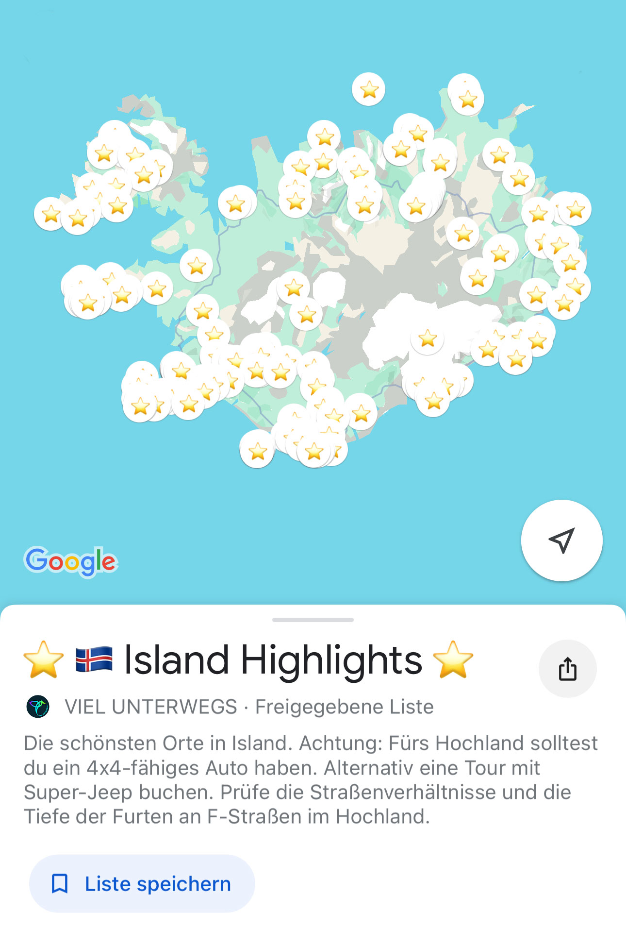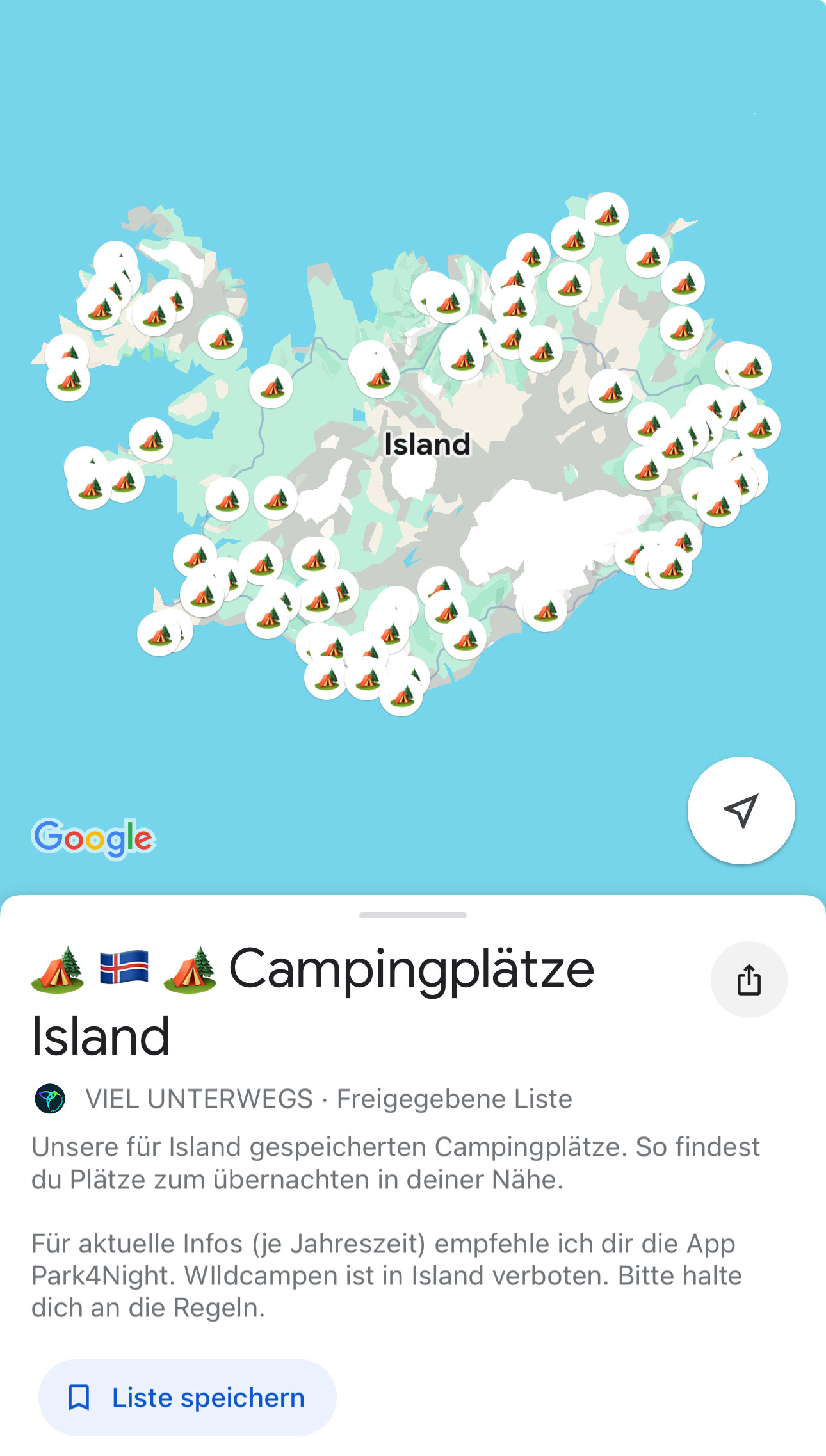 Wir haben begonnen, unsere privaten Listen mit Sehenswürdigkeiten, Restaurants, Cafés, Geheimtipps und Übernachtungsmöglichkeiten zu veröffentlichen. In diesen findest du viel mehr Tipps als in den kostenlosen Blogbeiträgen. Hier siehst du am Beispiel unserer Karte für Island, wie viele Spots wir besucht und gespeichert haben. Mit einem Klick kannst auch die diese Karte offline bei deiner nächsten Reise nutzen. So siehst du, wo der nächste Wasserfall, das nächste Highlight oder ein cooler Campingplatz ist. Sieh dir hier all unsere Guides als Karten für die nächste Reise an.