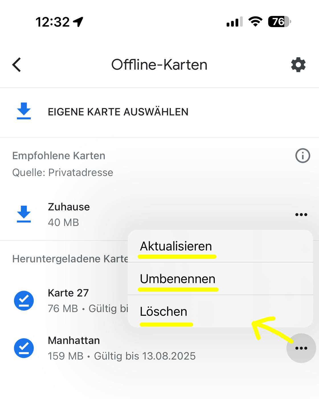 Manuelle Aktualisierung: Menü Offline-Karten aufrufen und auf die drei Punkte neben der Karte klicken, die du aktualisieren möchtest. Wenn du diesen Vorgang jedoch automatisierst, kannst du das manuelle Aktualisieren sparen.