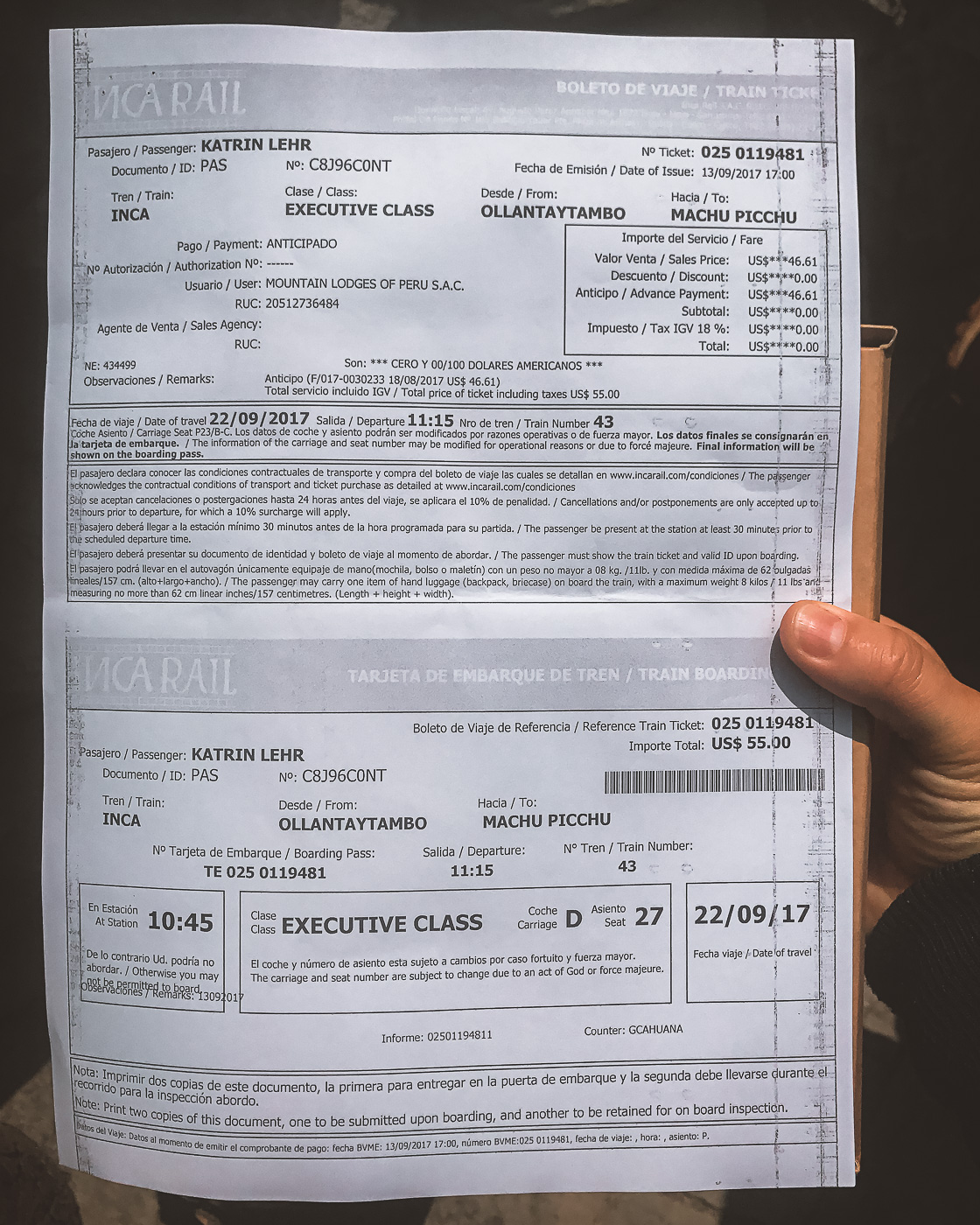 Unser Ticket für 55 US-Dollar war für die "Executive Class" bei Inca Rail. Bei beiden Anbietern gilt, dass du nur beschränkt Gepäck mitnehmen darfst.