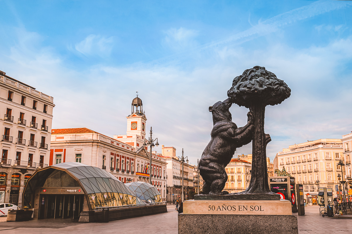 Willkommen am Tor der Sonne, was Puerto del Sol übersetzt heißt. Mitten im Zentrum Madrids lädt dieser malerische Platz zum Verweilen und Entspannen ein. Auch wichtige politische Veranstaltungen finden regelmäßig auf dem Puerta del Sol statt. In der Silvesternacht verwandelt sich der Plaza in ein Spektakel. Beim legendären doce uvas um Mitternacht heißen die Madrider das neue Jahr gebührend willkommen.