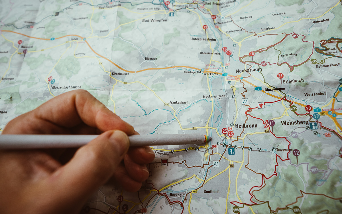 - Gehe 5 km in eine Richtung immer geradeaus den Weg entlang. In Heilbronn liegt der Neckar, ideal um ihm eine vorab ausgemachte Anzahl an Kilometern zu folgen.
