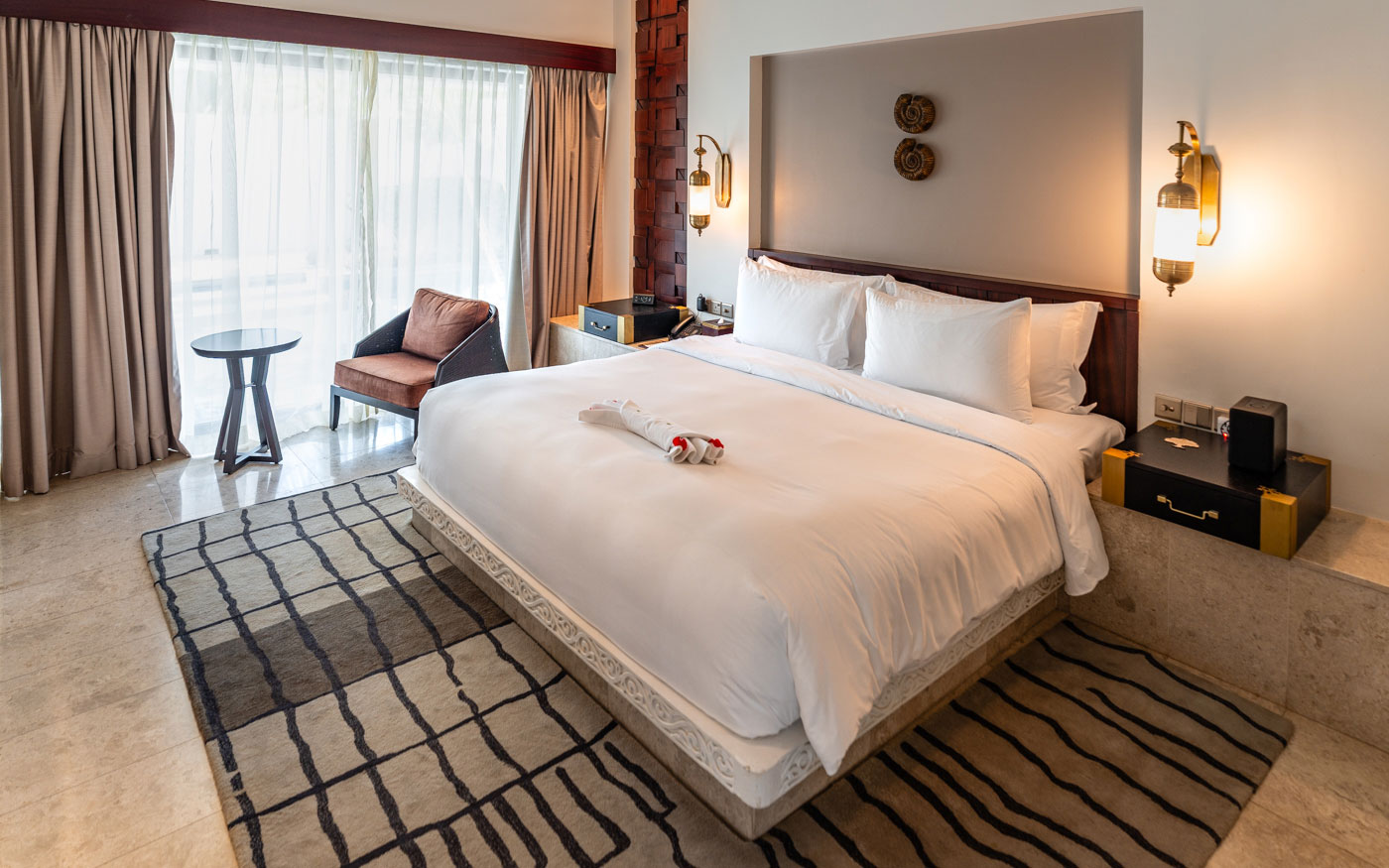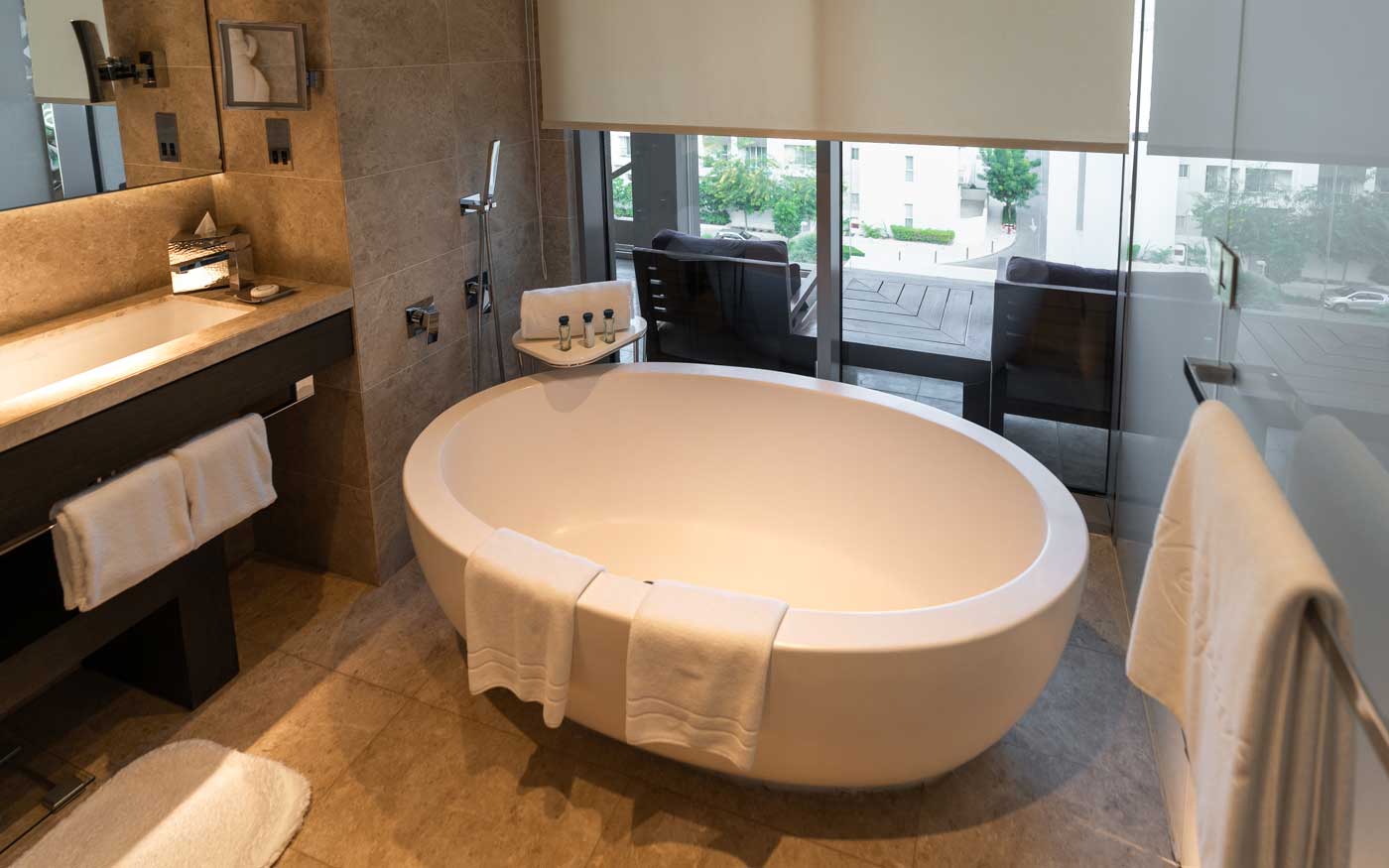 Das 5-Sterne-Hotel befindet sich nur wenige Minuten mit dem Taxi vom Flughafen entfernt. Ideal für alle, die wie wir sehr früh am Morgen landen und schnell ins Hotel möchten. Die Zimmer (hatten ein Upgrade) waren riesig, die frei stehende Badewanne sehr cool. Schöner wäre der Blick aus Meer gewesen, aber den hatten Mitreisende (Bild mit Blick auf das Meer und den Pool).