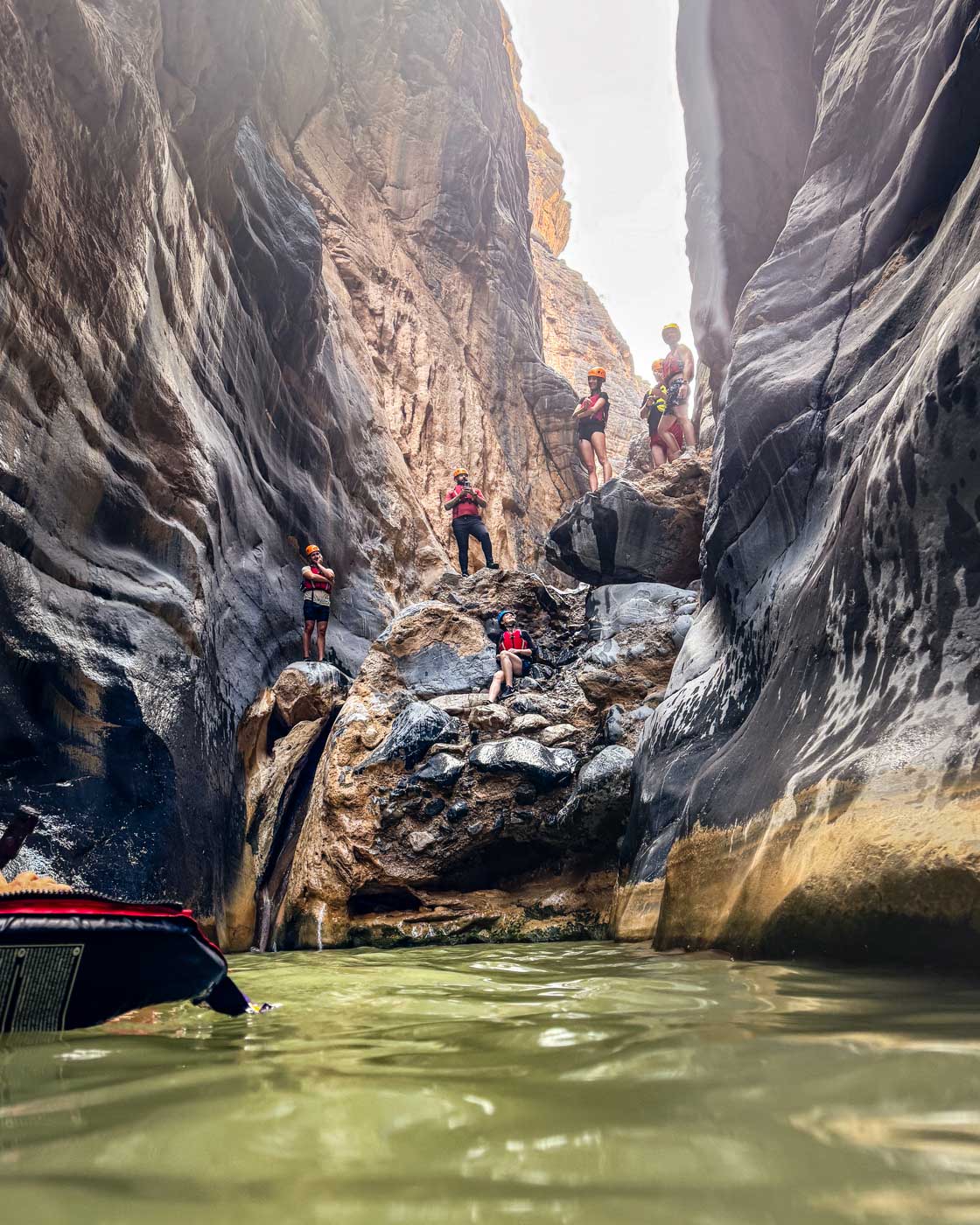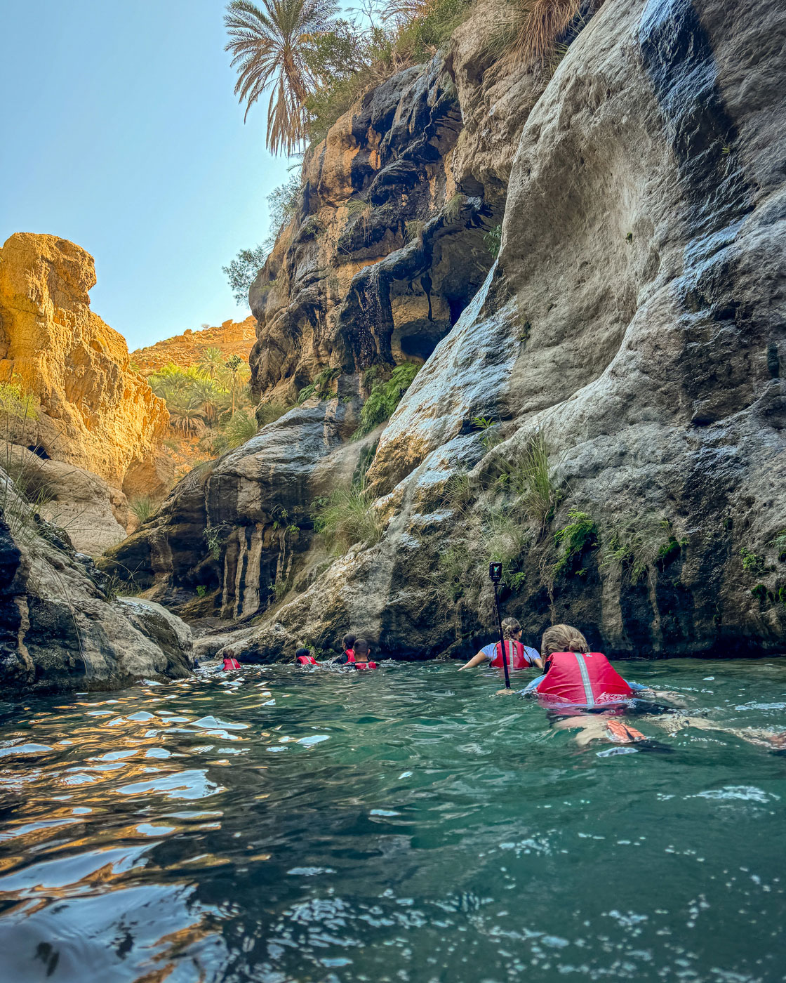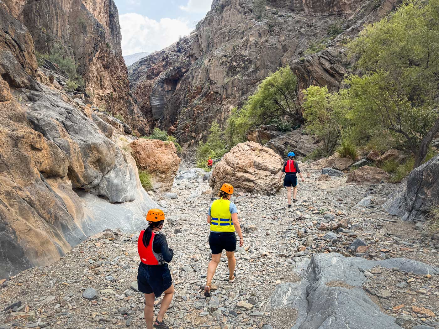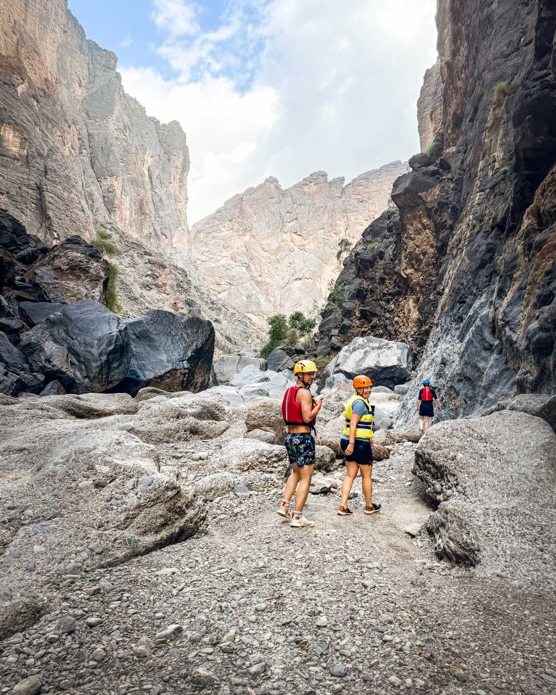 Bereit für Action? Dann ist der nächste Punkt definitiv etwas für dich: Canyoning im sogenannten Snake Canyon (oder auch Wadi Bani Awf). Bis hier kommst du eigentlich mit einem normalen Auto, es ist nur ordentlich staubig auf der Piste. Der letzte Ort nennt sich Zammah am Rande des Bachbetts des Wadi Bani Awf. Hier parken wir unsere Autos (nicht im Flussbett parken), ziehen uns um (es gibt Klos mit Duschen) und dann geht es mit zwei unserer Autos nach oben. Für diese Unternehmung brauchst du einen lokalen Guide, Helme und es werden leichte Schwimmwesten verteilt.