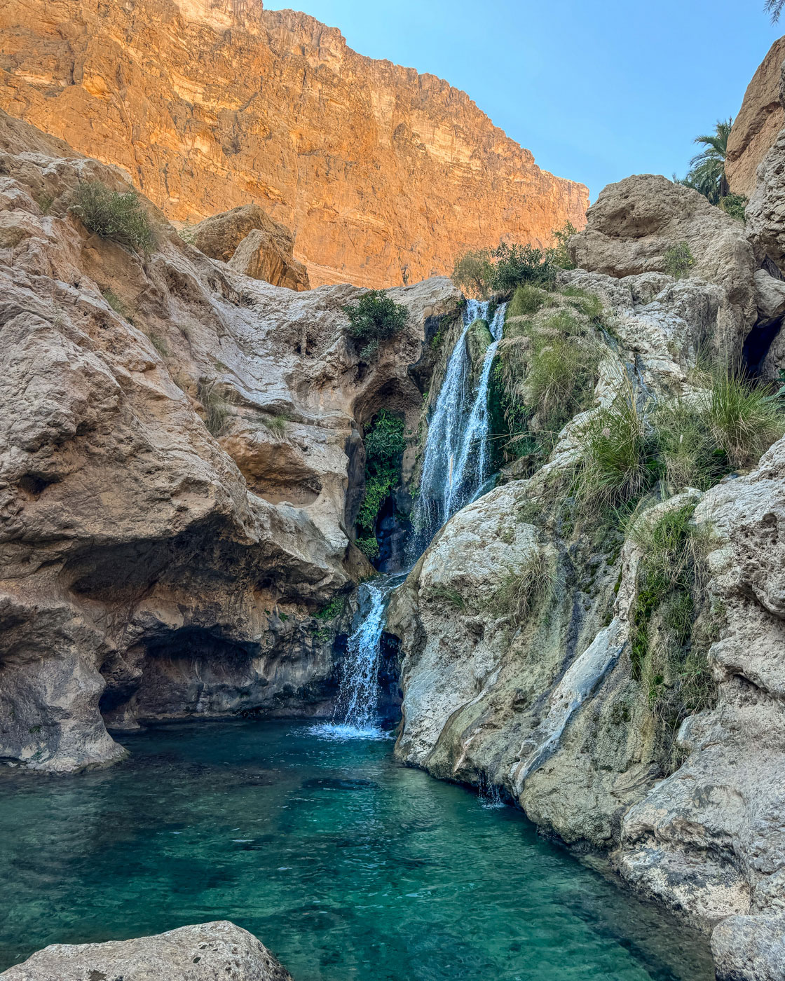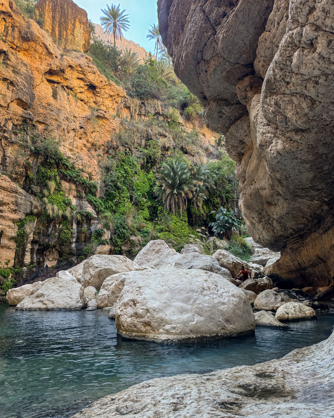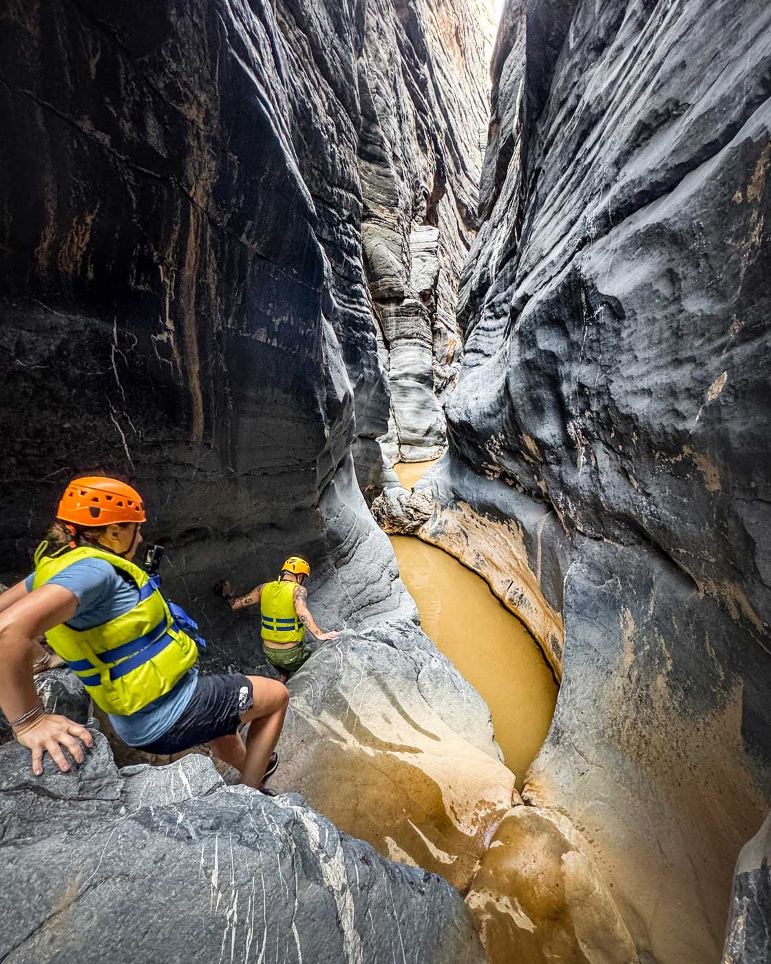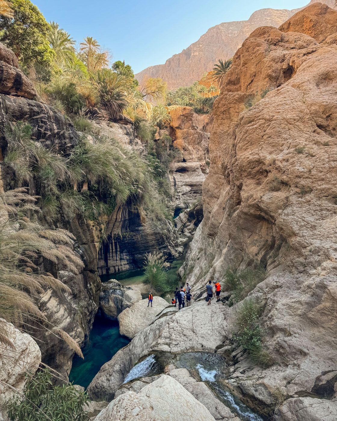 Bereit für Action? Dann ist der nächste Punkt definitiv etwas für dich: Canyoning im sogenannten Snake Canyon (oder auch Wadi Bani Awf). Bis hier kommst du eigentlich mit einem normalen Auto, es ist nur ordentlich staubig auf der Piste. Der letzte Ort nennt sich Zammah am Rande des Bachbetts des Wadi Bani Awf. Hier parken wir unsere Autos (nicht im Flussbett parken), ziehen uns um (es gibt Klos mit Duschen) und dann geht es mit zwei unserer Autos nach oben. Für diese Unternehmung brauchst du einen lokalen Guide, Helme und es werden leichte Schwimmwesten verteilt.