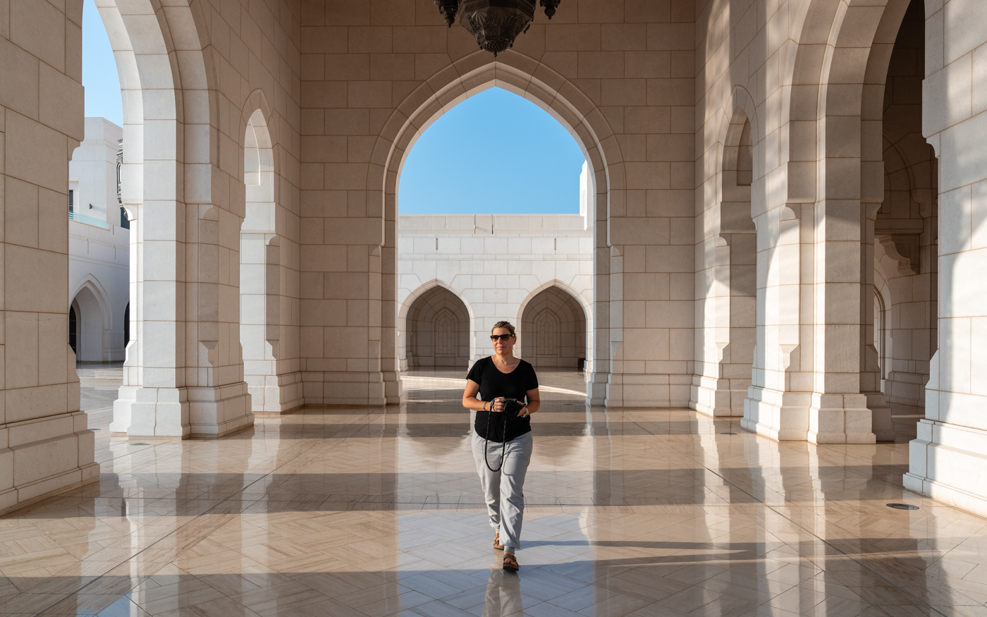 Für nicht muslimische Besucher ist die Moschee nur samstags bis donnerstag von 8 Uhr - 11 Uhr geöffnet. Der Eintritt ist frei. Achte unbedingt auf angemessene Kleidung (sieh dir dazu meine Oman Tipps an): als Frau müssen die Haare bedeckt sein, lange Hose oder Rock (über die Knie) und Schultern bedeckt. Auch für Männer gilt: T-Shirt (oder Leinenhemd) und lange Hose.