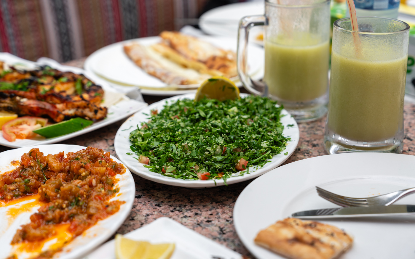 Als wir mit dem Sightseeing Programm durch sind, geht es erstmal so richtig authentisch essen. Wir wählen Fisch, Hummus, Shawarma, Kebab, Tabuleh, Motabal, Baba ganoush und Pmmes. Wirklich köstlich. Vor allem die frischen Säfte (Mango Saft) sind hervorragend.