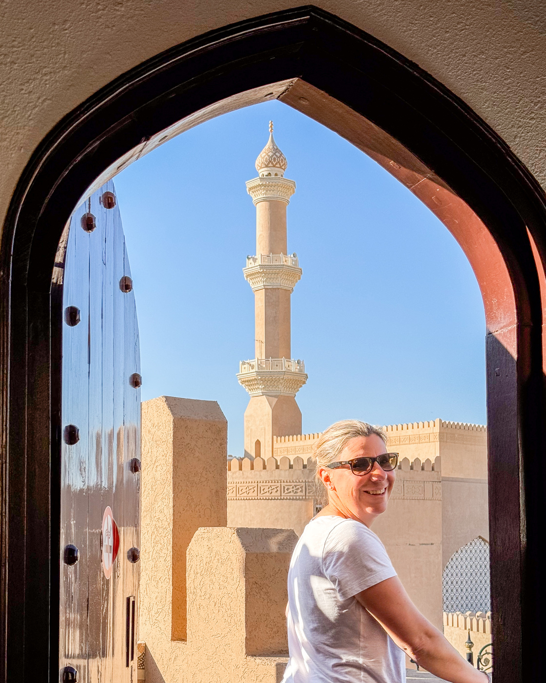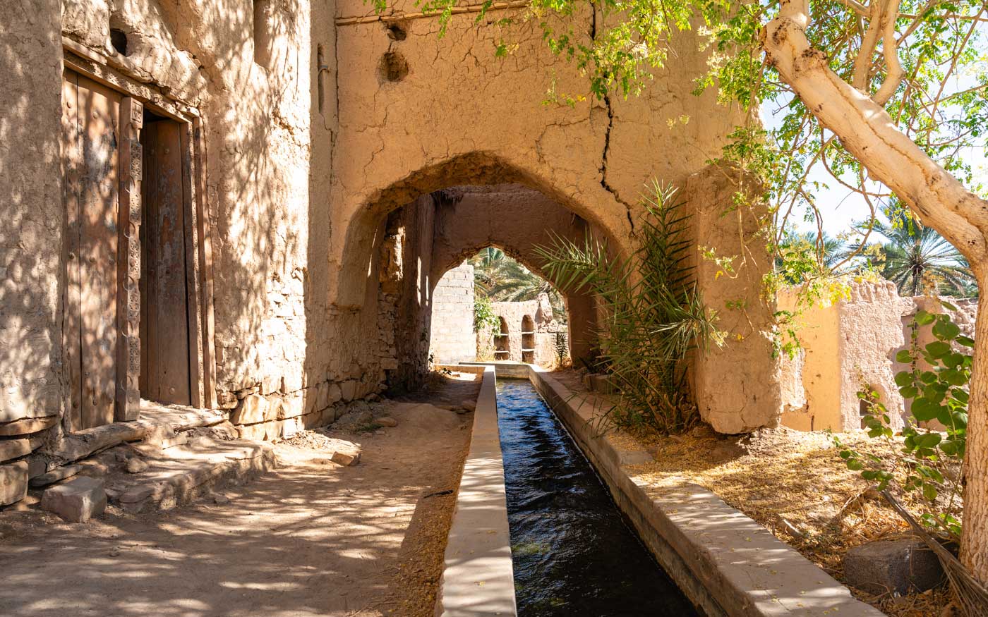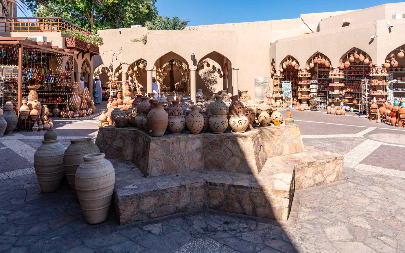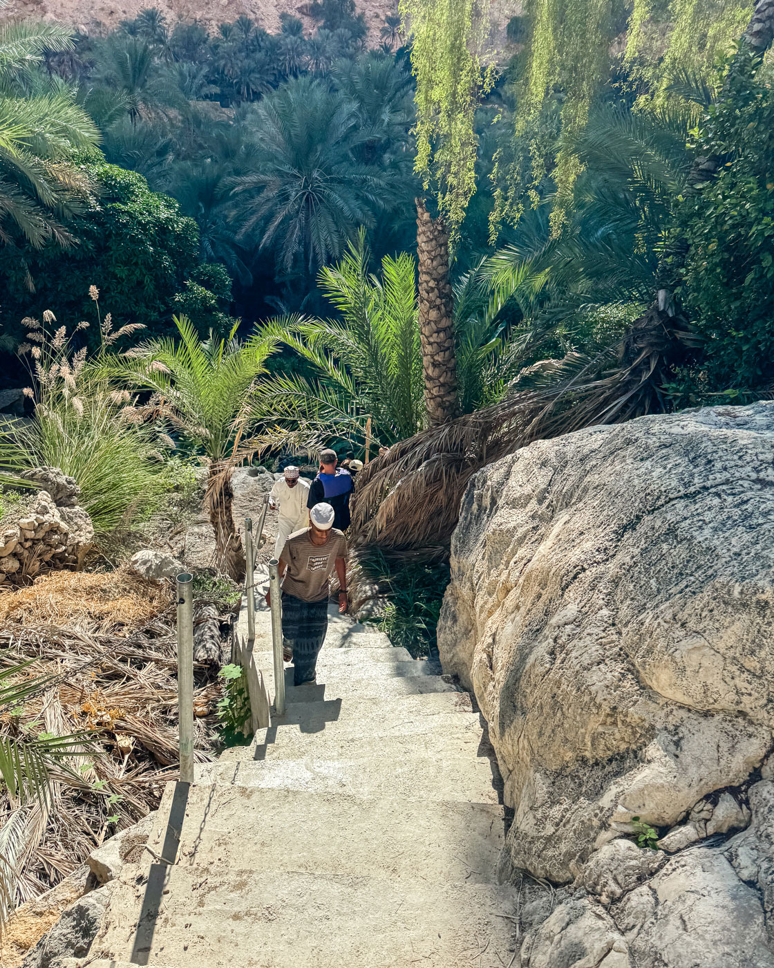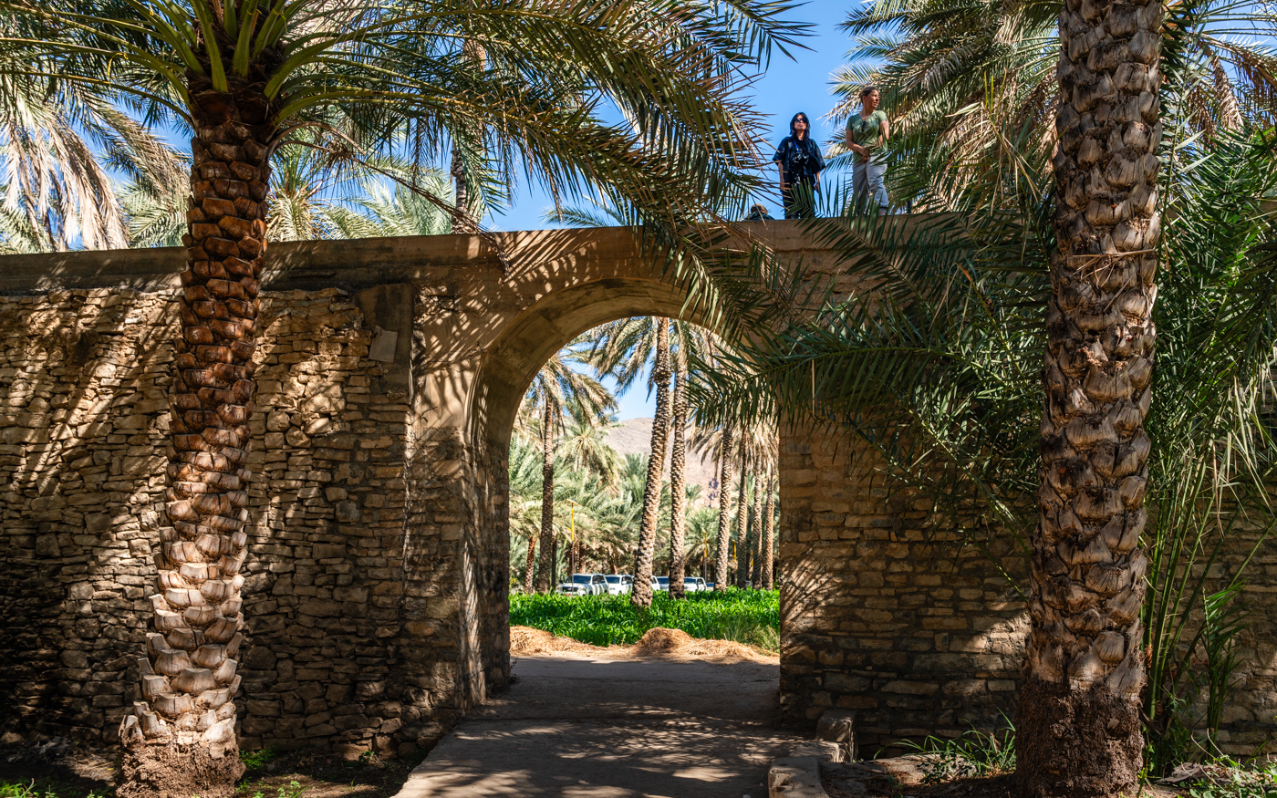 Begib dich hinein in die kleine Altstadt mit verwinkelten Gassen, Cafés auf Dächern bis hin zum wunderschönen Oasengarten mit Falajs, dem alten Bewässerungssystem des Omans und UNESCO-Weltkulturerbe (hier nachlesen warum). Uns wird das System der Bewässerungsanlagen, die schon 500 n. Chr. (manche eventuell sogar bereits 2500 v. Chr.) installiert wurden, erläutert. Vor allem der Oasengarten am Ende der vielen Treppenstufen ist zauberhaft schön. Wenn die Sonne nicht so intensiv auf uns hinab scheinen würde, könnte ich hier stundenlang sitzen.
