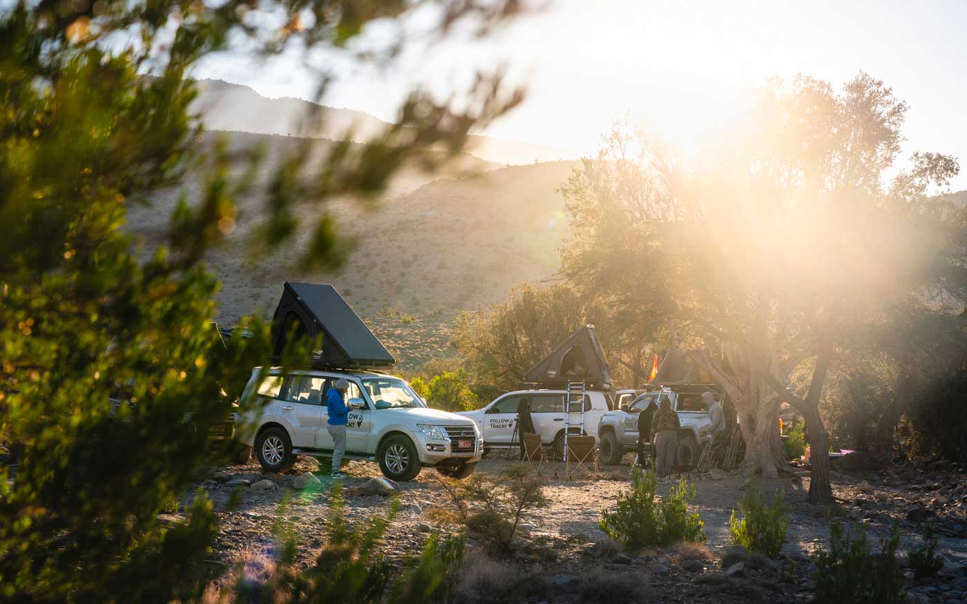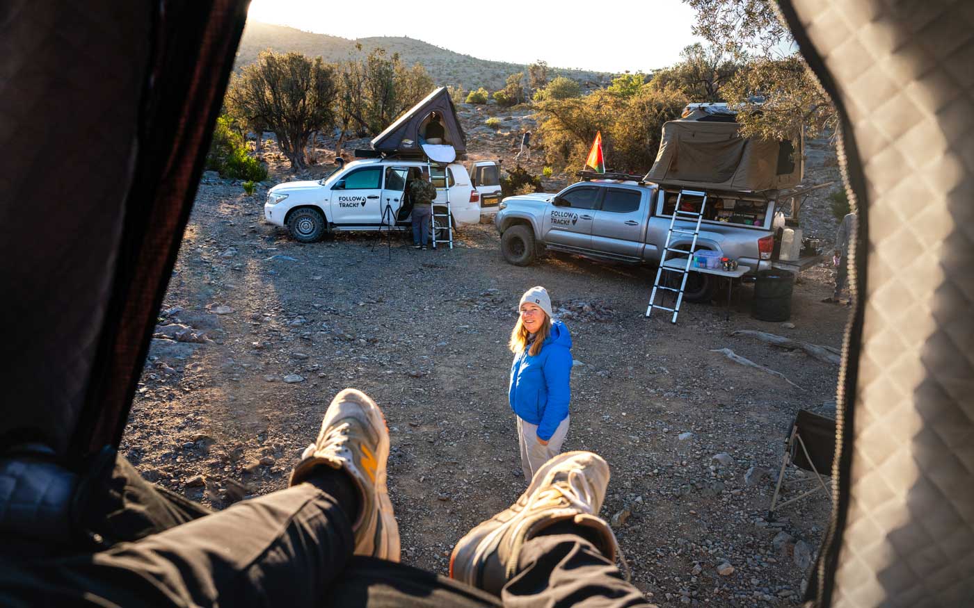 Nach einer kalten Nacht im Dachzelt genießen wir am nächsten Morgen den Sonnenaufgang - wunderschön.