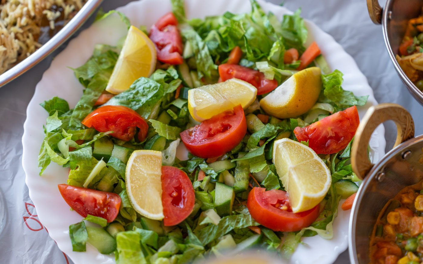 Hier lernen wir, dass BBQ im Oman vorwiegend eins bedeutet: Fleisch. Es gibt frisch zubereiteten Hummus, Pita-Brot, Salat und sehr viele Hühnchen und Lammspieße. Köstlich, doch selbst für Fleischesser zu viel des Guten. Beilagen benötigen Omanis nicht. Für Vegetarier schwierig in der Gruppe.
