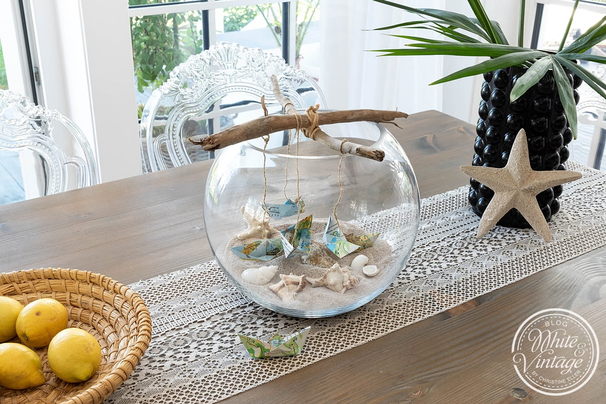 Dekoriere ein Tablett mit Dekosand, Muscheln, einem Segelschiff, einem Leuchtturm und einem Liegestuhl oder Strandkorb. Platziere eine kleine Kamera und eine Schatzkiste. Darin kannst du entweder das Geldgeschenk oder den Gutschein unterbringen.