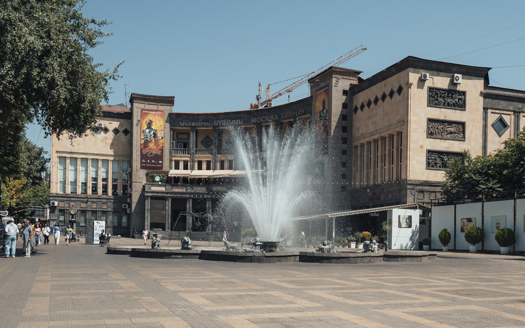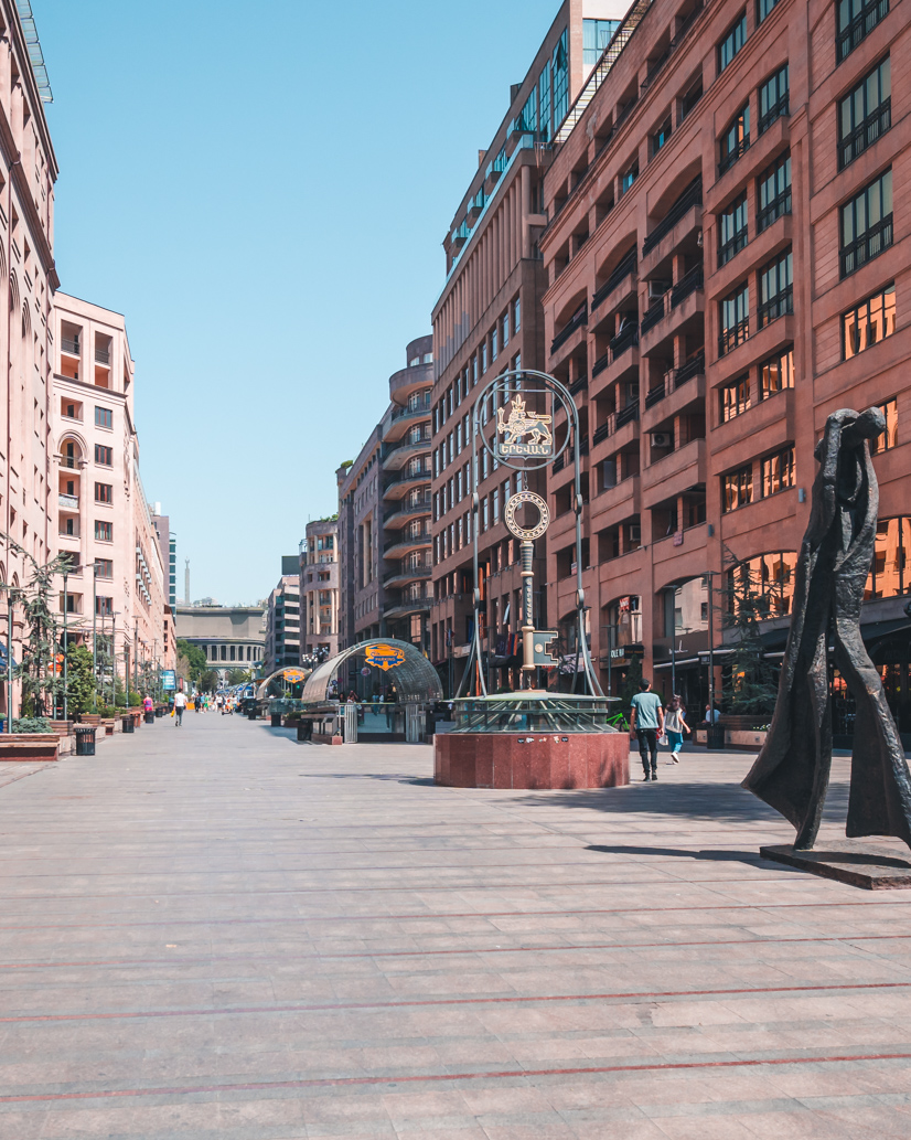 Auf der Abovyan Street geht es weiter, vorbei am Moskau Kino: Der strahlende Brunnen auf dem Charles Aznavour Platz davor so wie wechselnde Kunstobjekte wirken fast schon verspielt.