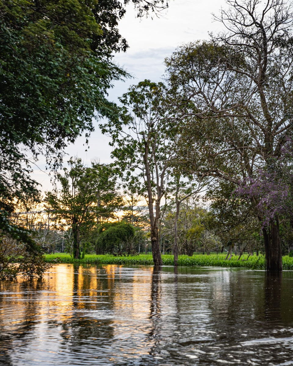 Auf dem Rückweg machten wir noch einen Abstecher zum naheliegenden „Janauari”-See. Auch hier erkundeten wir die Nebenkanäle nach Getier, Bäumen und Blüten, bevor wir pünktlich zum wunderschönen, glühenden Sonnenuntergang den Rückweg zum Mutterboot antraten.