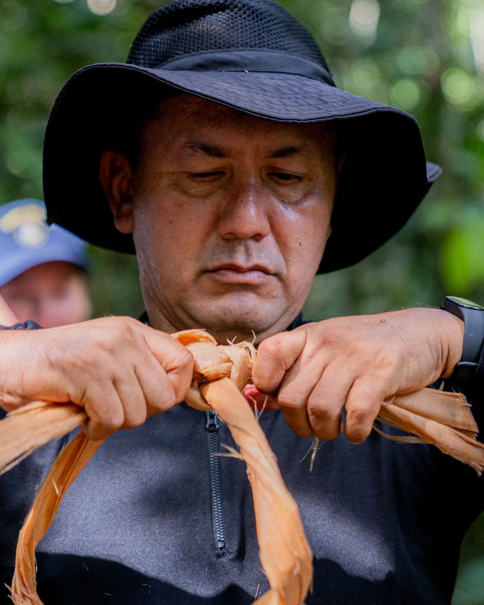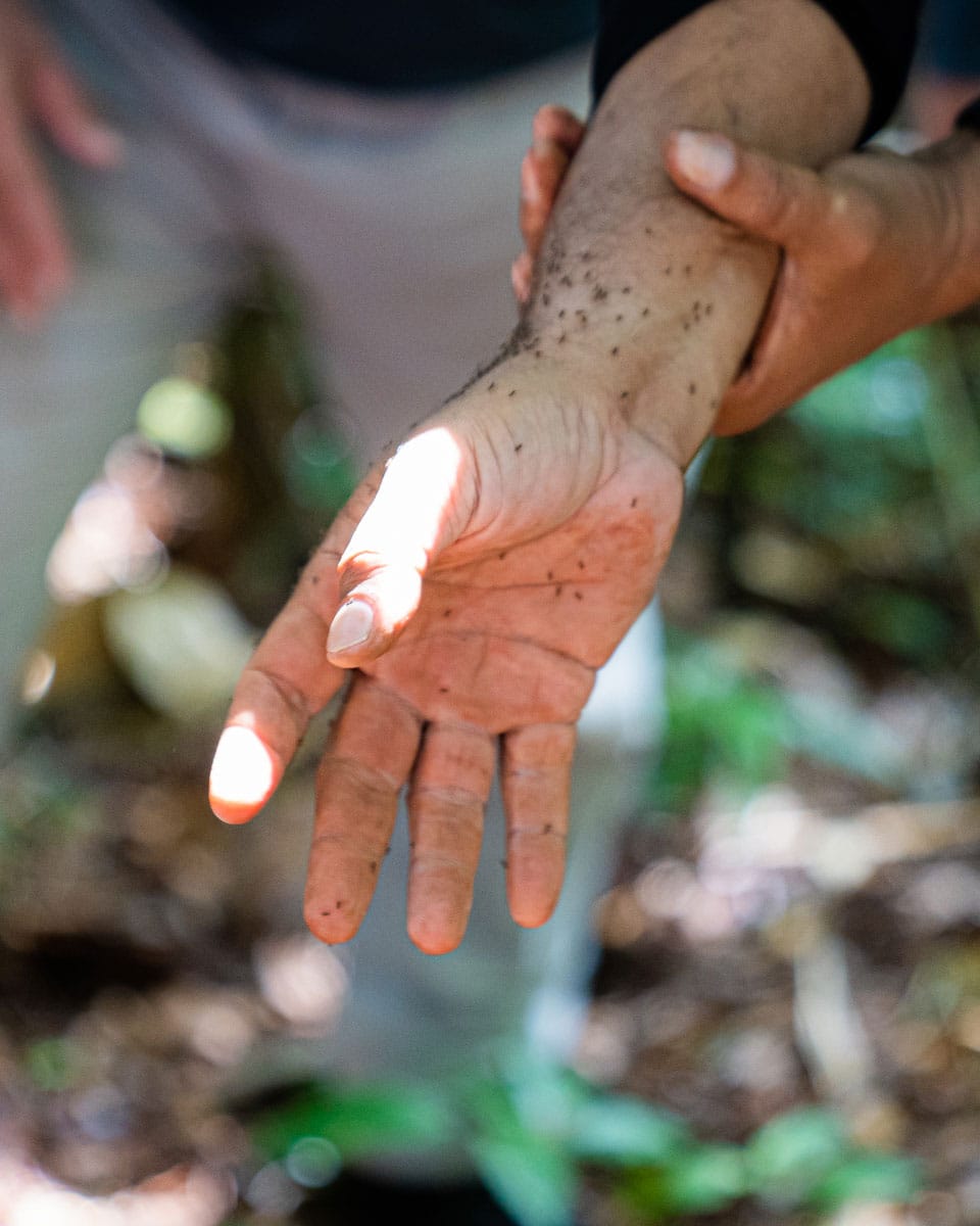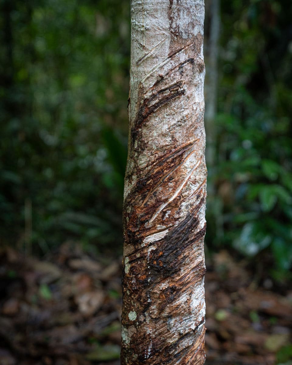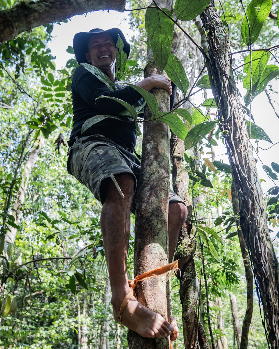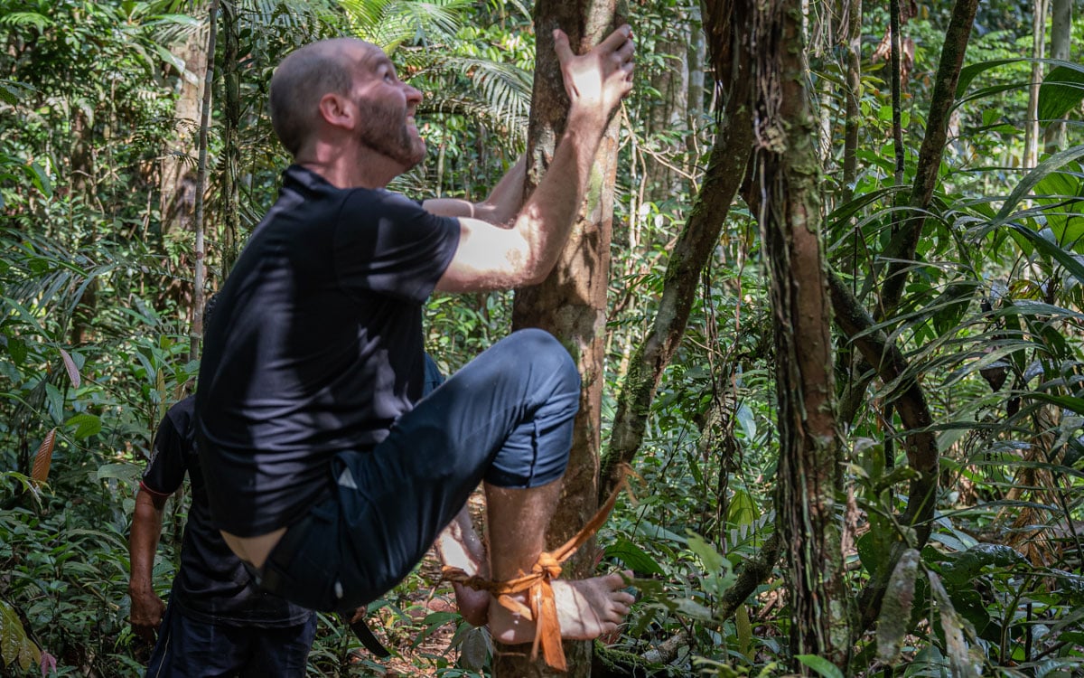 So war die Rindenflüssigkeit des einen Baumes ein super Kaugummiersatz, während ein anderer Trinkwasser spendete oder Kleidung rot färben konnte. Er zeigte uns Ameisen, deren Körperflüssigkeit nach dem Zerreiben als wohlduftender Mückenschutz fungierte. Und falls sich doch mal einen Jaguar zu dir verirren sollte, klettert man mit einer selbstgebauten Fußschlaufe auf den nächstgelegenen Baum (wenn man es denn kann).