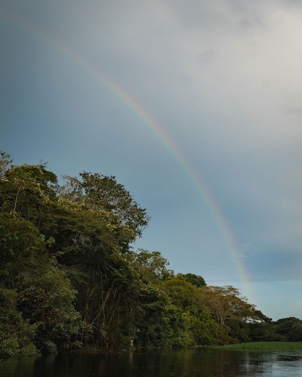 Gewappnet mit wasserfesten Jacken fuhren wir durch die Nebenkanäle des Amazonas’ und sahen viele exotische Vögel und einige Kapuzineräffchen. Dem mäßigen Wetter sei Dank sahen wir dann einen doppelten Regenbogen über dem dichten Dschungelgrün.