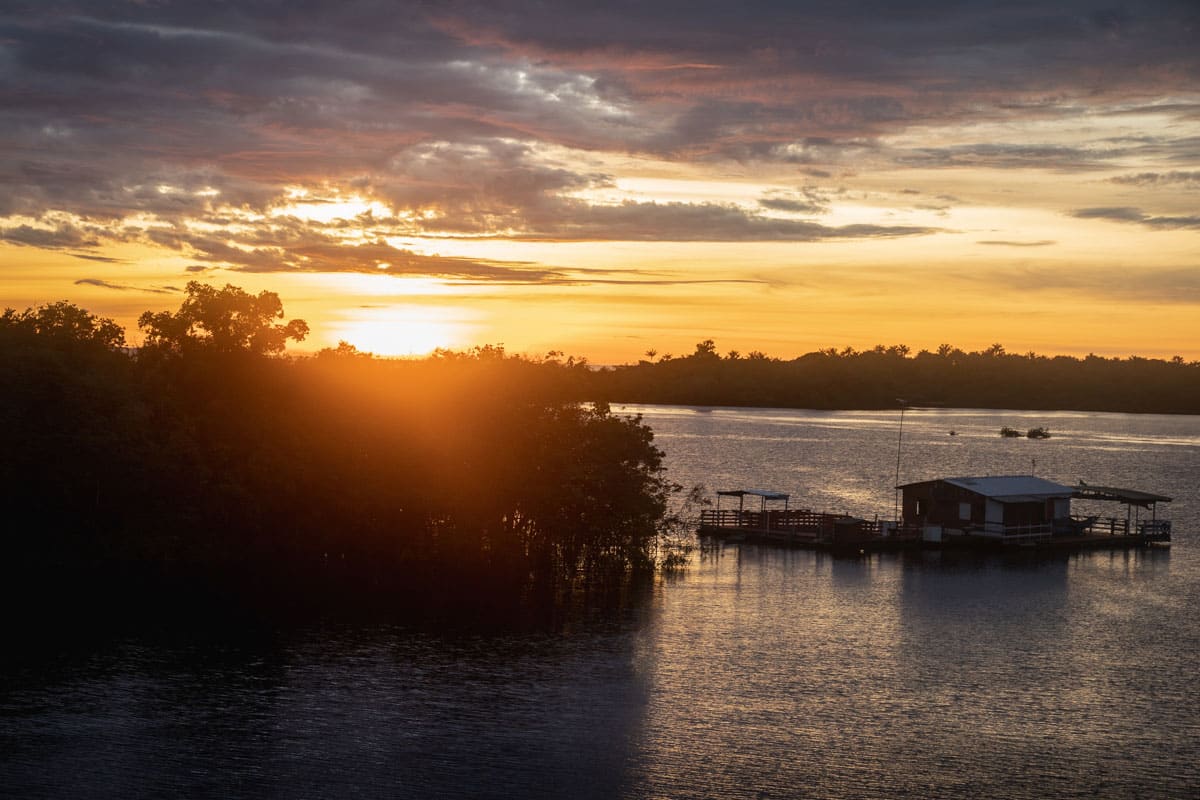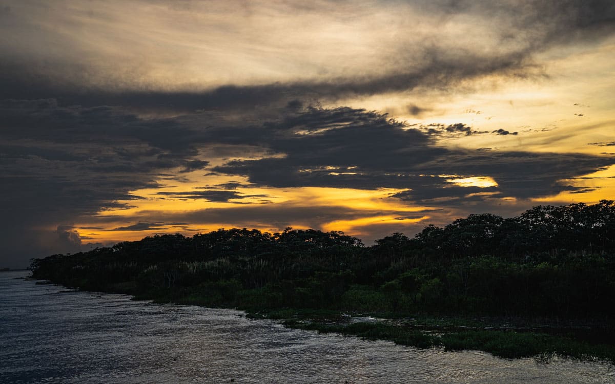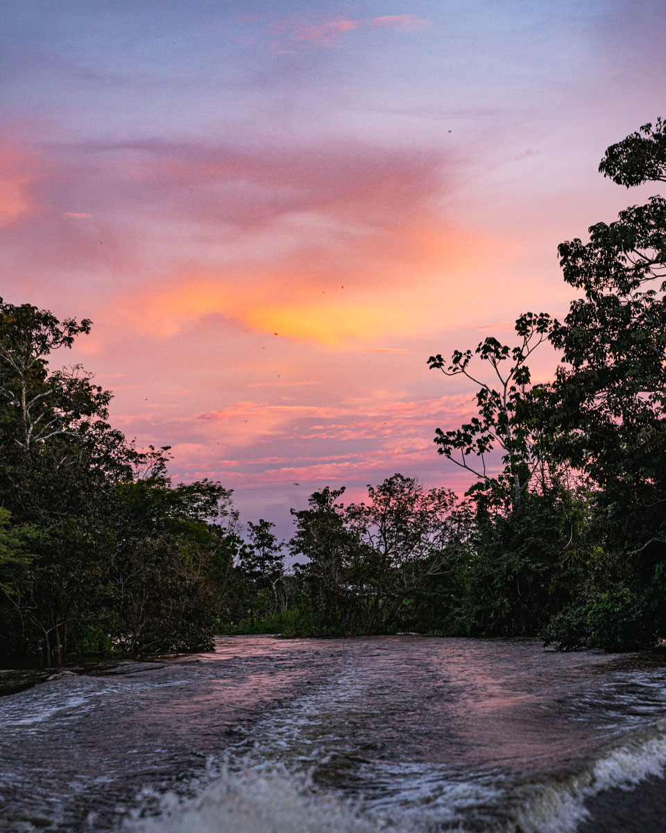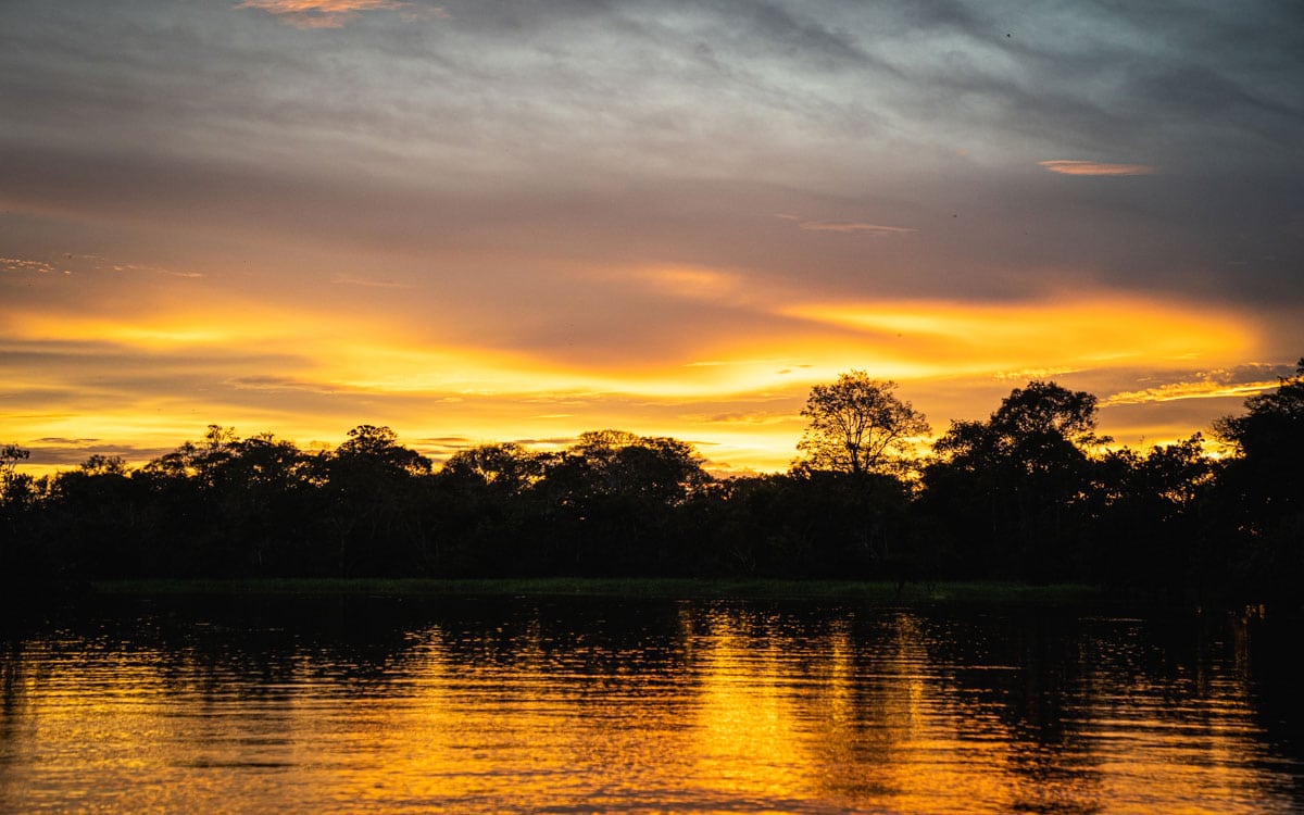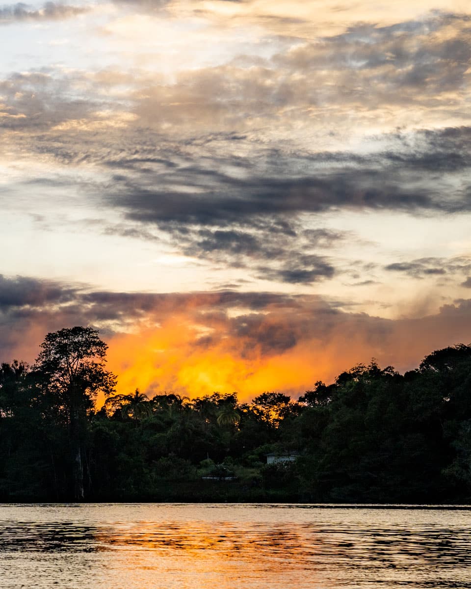 Wir begutachteten den Sonnenuntergang von der Einsamkeit des Wassers aus. Im Boot wurde es immer stiller, als sich der glühende Stern hinter den Urwald schob.