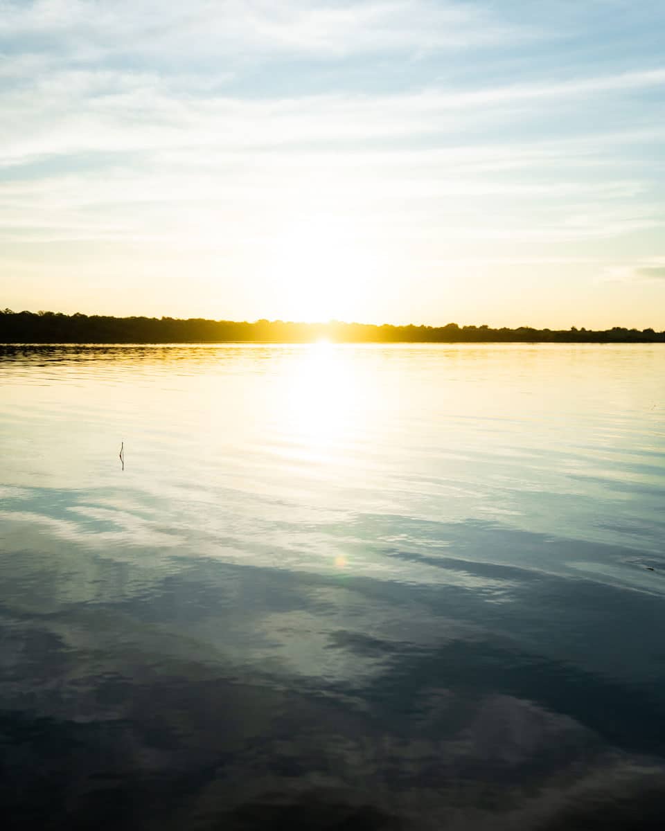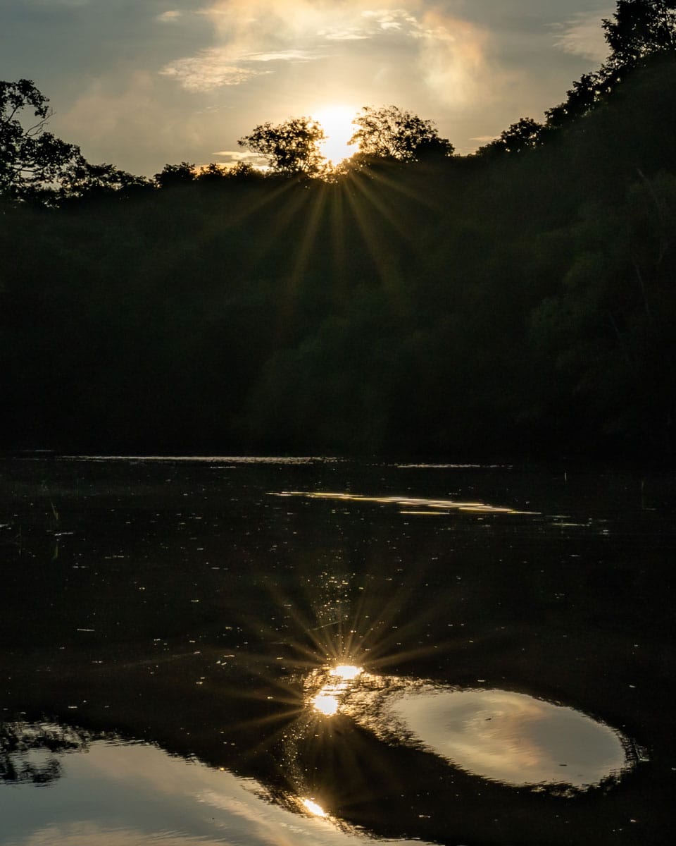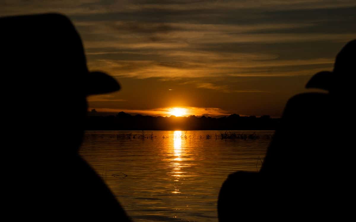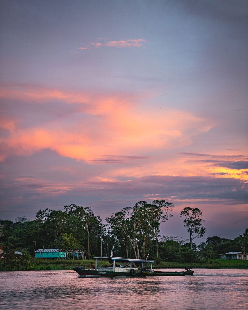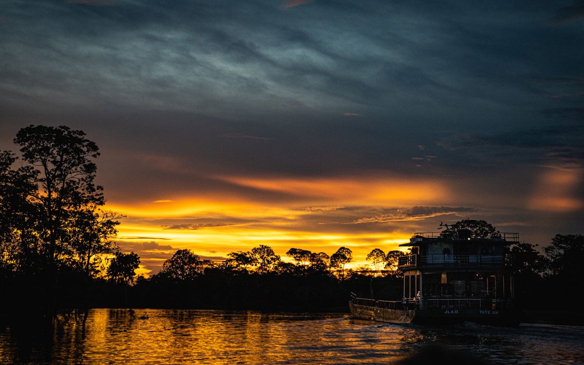 Wir begutachteten den Sonnenuntergang von der Einsamkeit des Wassers aus. Im Boot wurde es immer stiller, als sich der glühende Stern hinter den Urwald schob.