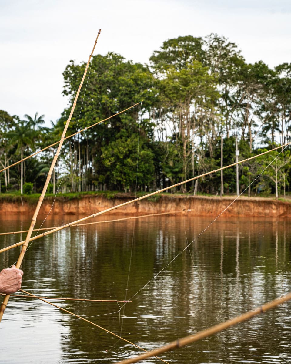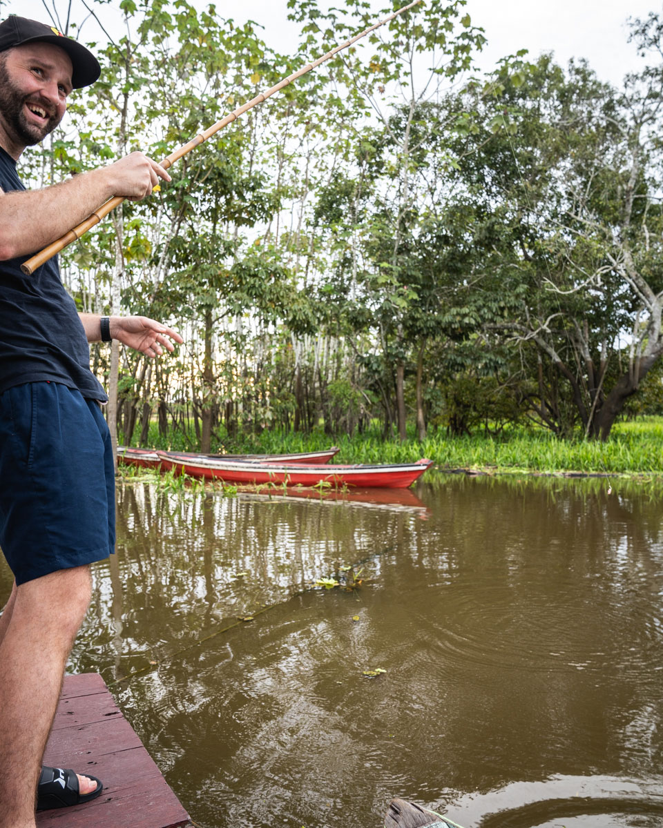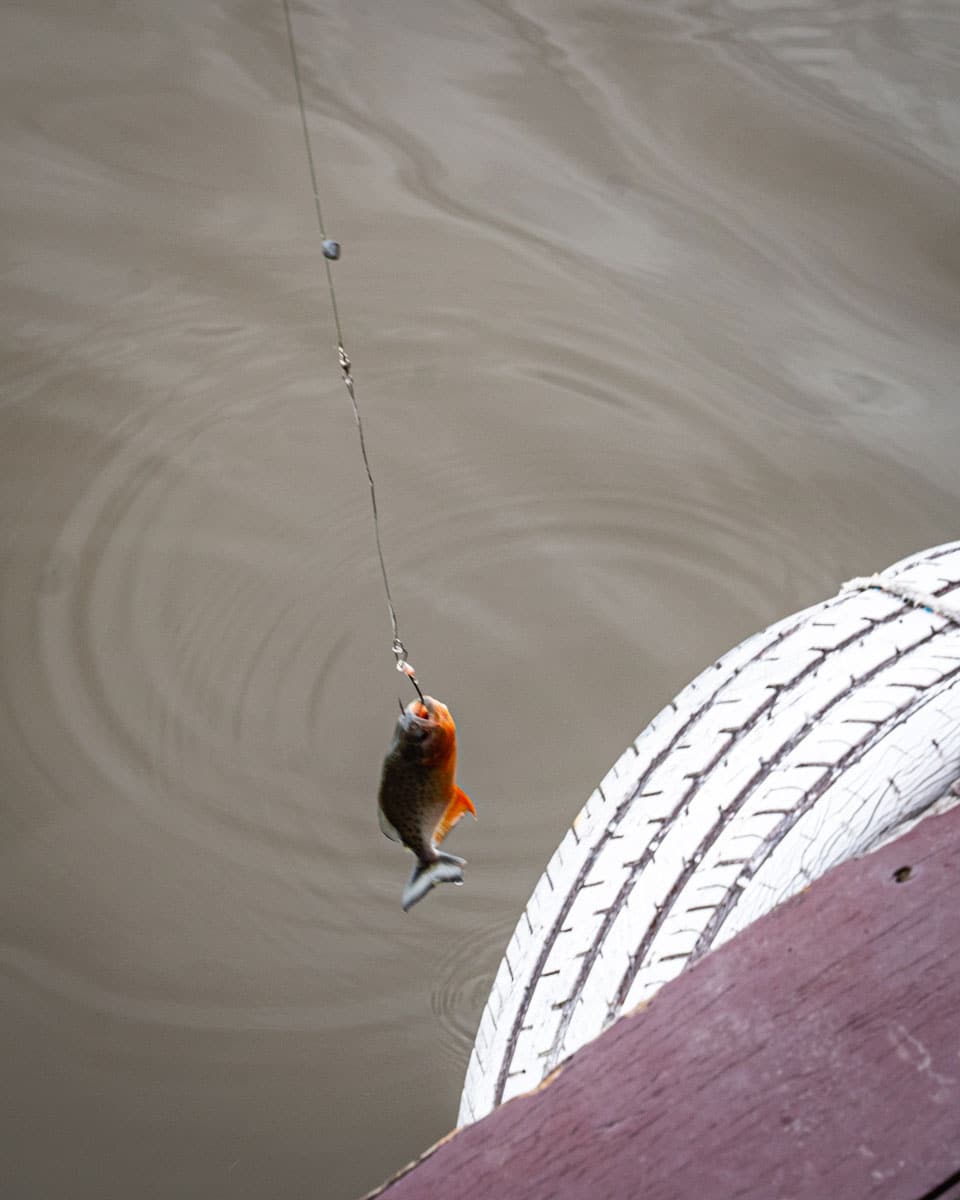 Ganz klassisch, mit Bambusstöcken und rotem Fleisch als Köder, dauerte es nicht lange, bis die ersten der latent nervösen Fleischfresser an der Angel hingen. Nicht alle bissen sich allerdings ausreichend am Haken fest, und so mutierten viele Knabberer für eine Millisekunde zu geschleuderten Flugfischen.
