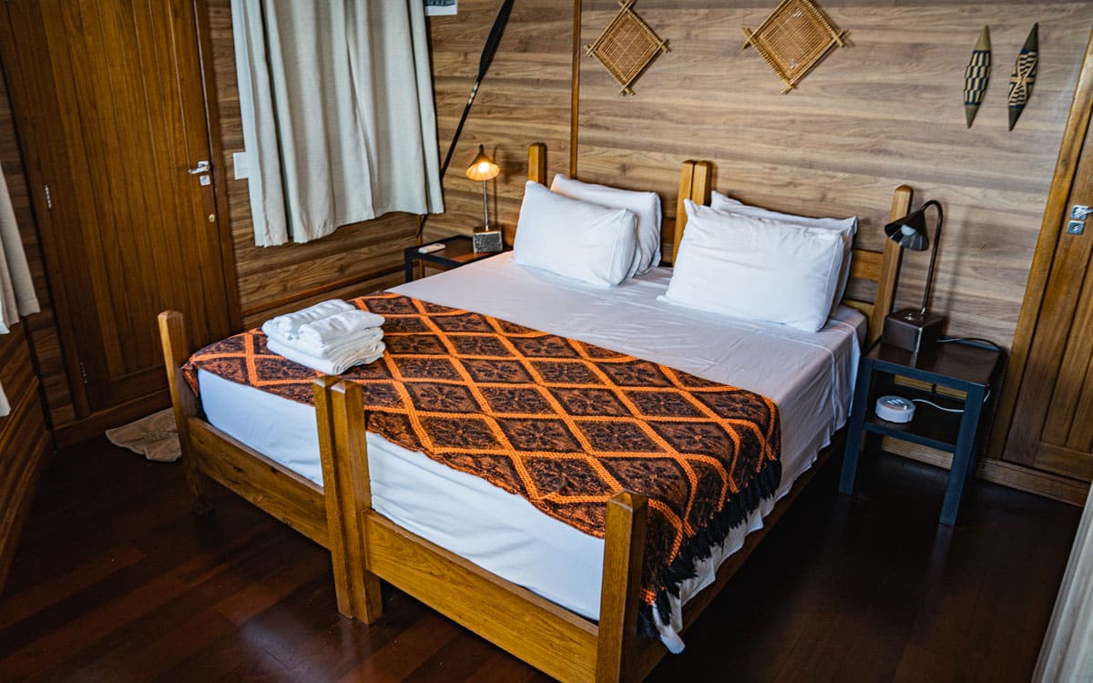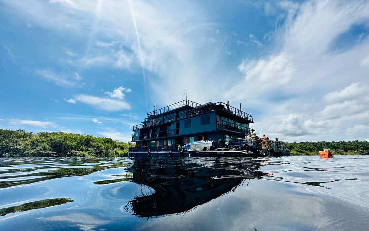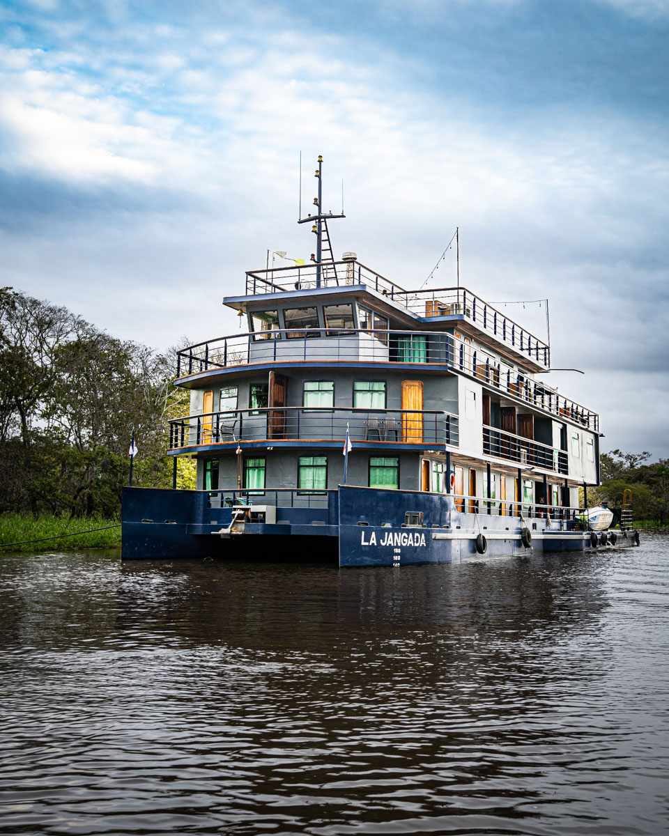 Die hübsche MS Jangada ist 34 Meter lang, wurde 2019 gebaut und erst in diesem Jahr generalüberholt. Insgesamt bietet das Schiff Platz für 24 Gäste sowie Crew, ist komfortabel ausgestattet mit einer gemütlichen Terrasse sowie ein Sonnendeck, einer Bar und einem Essensraum. Besonders ist der geringe Tiefgang, der es ermöglicht, in die Seitenarme des Amazonas' zu gelangen – wobei wir meistens mit einem der Beiboote ins Dickicht gefahren sind.