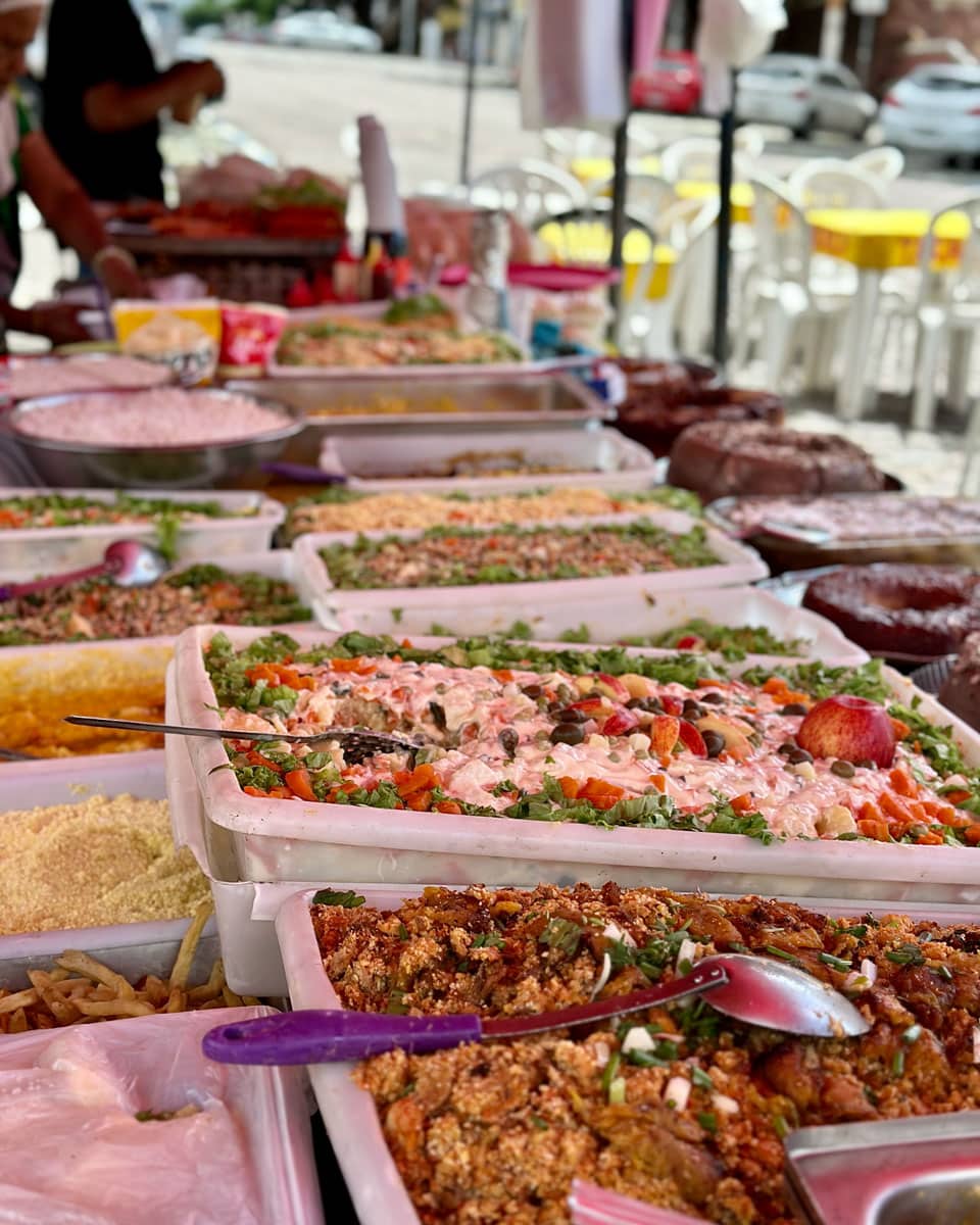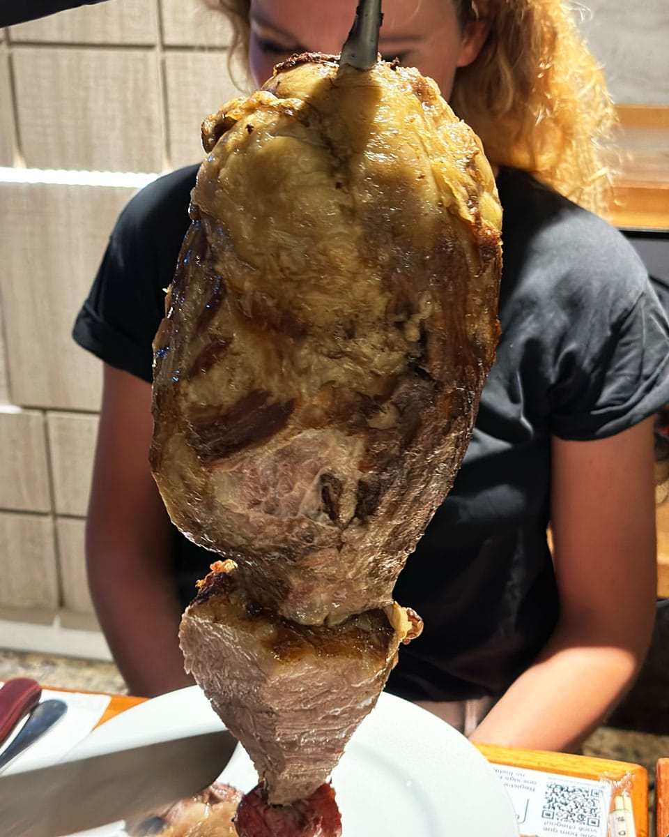 Wir drehten auf Grün und los ging’s: Im Minutentakt wurde uns ein ganzes Rind Stück für Stück vom Spieß auf den Teller geschnitten, wir kamen nicht mal zum Fotos machen; das reichhaltige Buffet hätten wir gar nicht gebraucht (und so, wie wir es beobachteten, bedienten sich auch die Einheimischen nur spärlich daran).