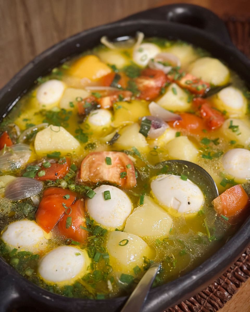 Zurück auf der Jangada legte diese gleich ab in Richtung Acajatuba-See, während unsere drei Köchinnen erneut köstliches Brasilianisches auf den Tisch brachten: Es gab „Caldeirada“, eine verführerisch salzig-säuerliche Brühe mit Kartoffeln, Tomaten und Eiern sowie in einer anderen Variante mit Tambaqui-Fischrippchen (massive Gräten, wie Knochen!) und vieeel Koriander. Köstlich.