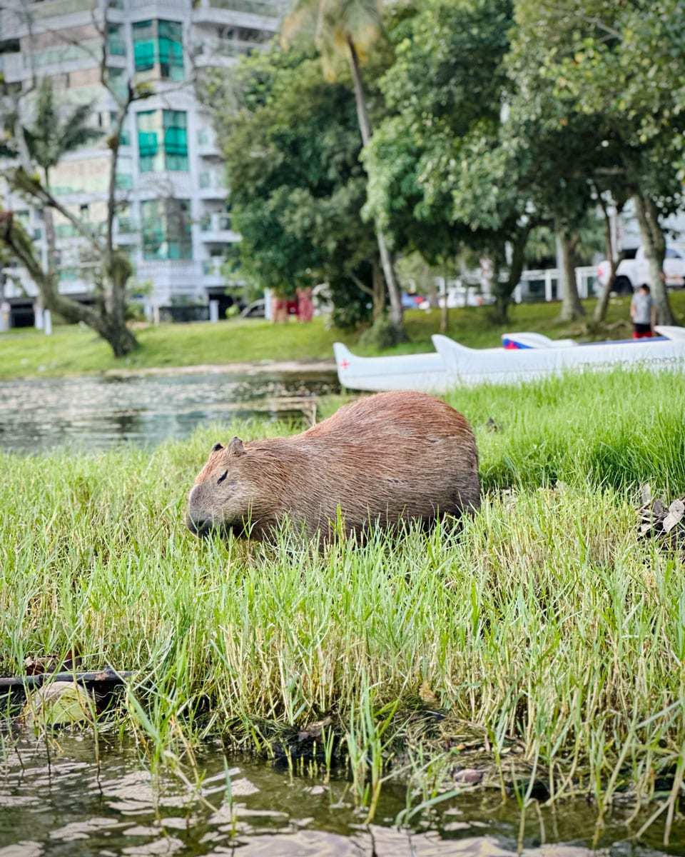 Danach ging es auf Jagd; Wir bekamen mit, dass es hier in der Stadt mancherorts Capybaras zu sehen gibt. Eines dieser süßen Riesen-Meerschweinchen fanden irgendwann – die genaue Geschichte kennt keiner – den Weg in den „Rodrigo de Freitas“-See und hat sich reichlich vermehrt. Und weil diese runden Dinger so süß sind, haben sie sich entsprechend schnell in die Herzen der Einheimischen gepummelt.