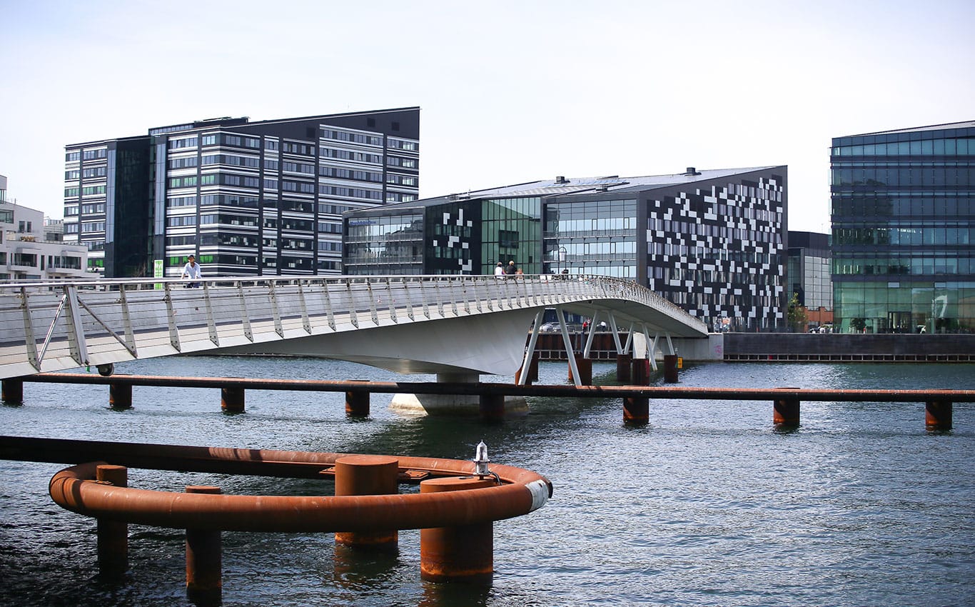 In diesem Viertel findest du besonders moderne Architektur. In den Gebäuden spiegeln sich Motive. Am besten morgens herkommen.