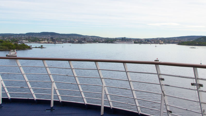 Schon früh bin ich wach: Wie schon auf meiner AIDA Tour wurde mir empfohlen, früh aufzustehen, um noch vor dem Frühstück Ausblicke bei der Fahrt durch das Oslofjord zu genießen. Im letzten Jahr konnte ich außer Nebel nichts erkennen, daher schnappe ich mir meine Kamera um bei milden Temperaturen und einer leichten Brise auf dem Außendeck die Landschaft zu begutachten.