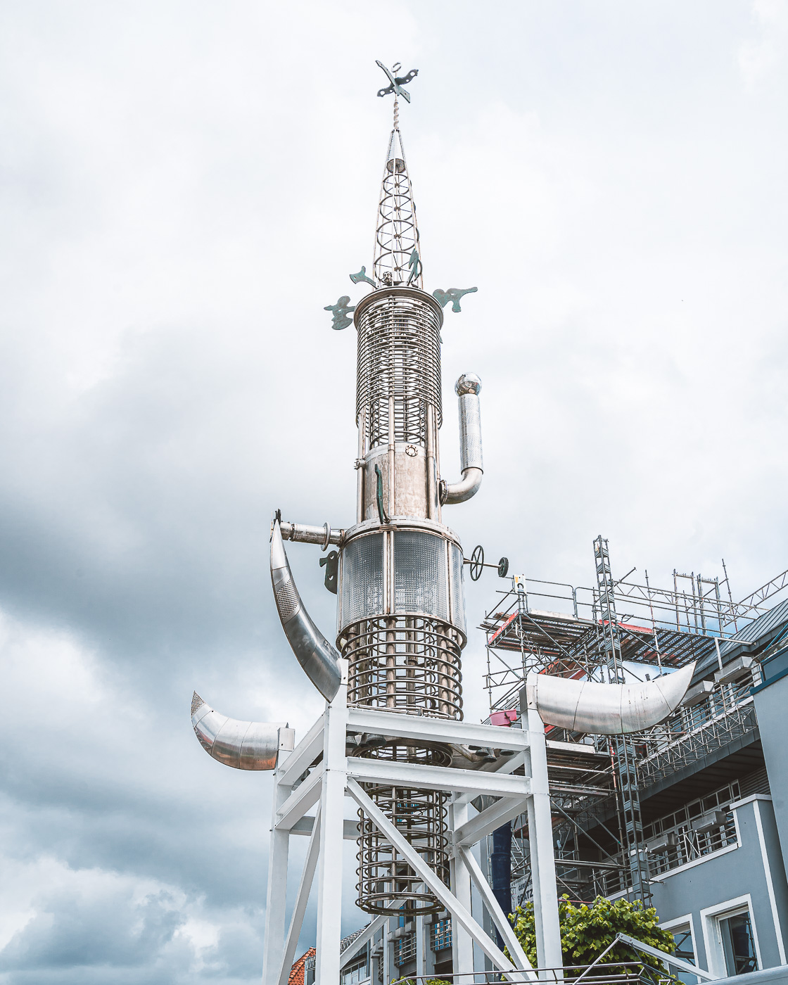 Die Materialien wurden aus Abfällen des Jülicher Forschungszentrums genommen. Vor allem Stahlrohre, die dann mit Plexiglas verkleidet wurden. Den Spitznamen "Weltraumpenis" oder Auricher "Tauchsieder" wirst du hier immer wieder hören. Schau dir den Sous Turm an und mach dir deine eigene Meinung.