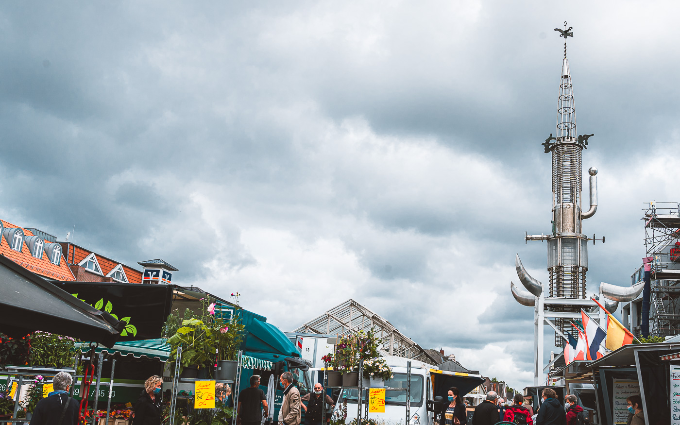 Auf dem Marktplatz befindet sich der umstrittene Sous Turm. Der 25 Meter hohe Turm ist ein Kunstobjekt, das polarisiert. Ich selbst war auch ein wenig irritiert beim Anblick, denn optisch passt er so gar nicht auf den Marktplatz, auf dem an meinem Besuch ein Markt stattfand.