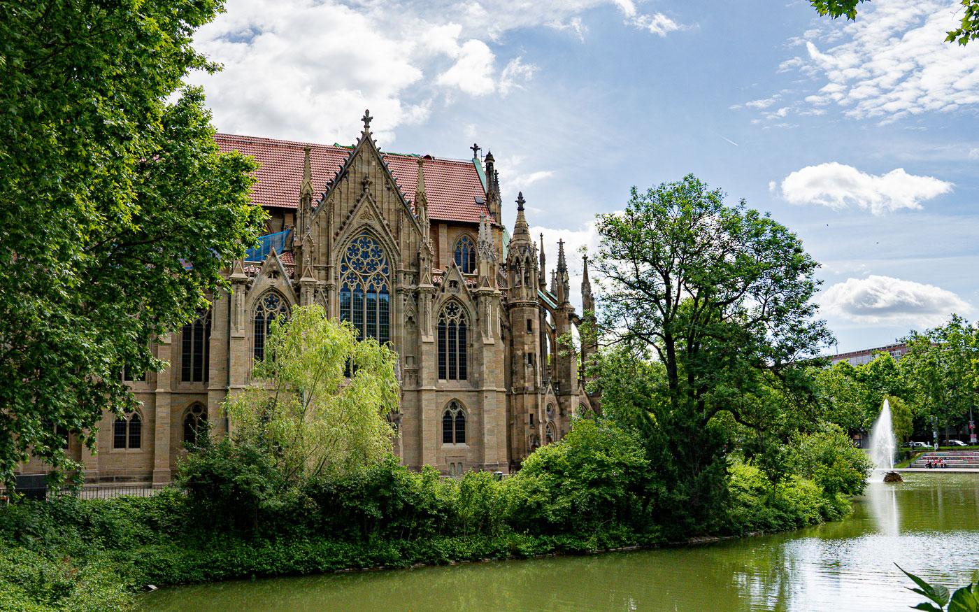 Weiter Richtung Stadtwesten: Der Feuersee mit der äußerst imposanten Johanneskirche liegt nicht weit. Die Kirche wurde im 19. Jahrhundert von Christian Friedrich von Leins, dem damals führenden Architekten Württembergs, erbaut und 1876 eingeweiht.