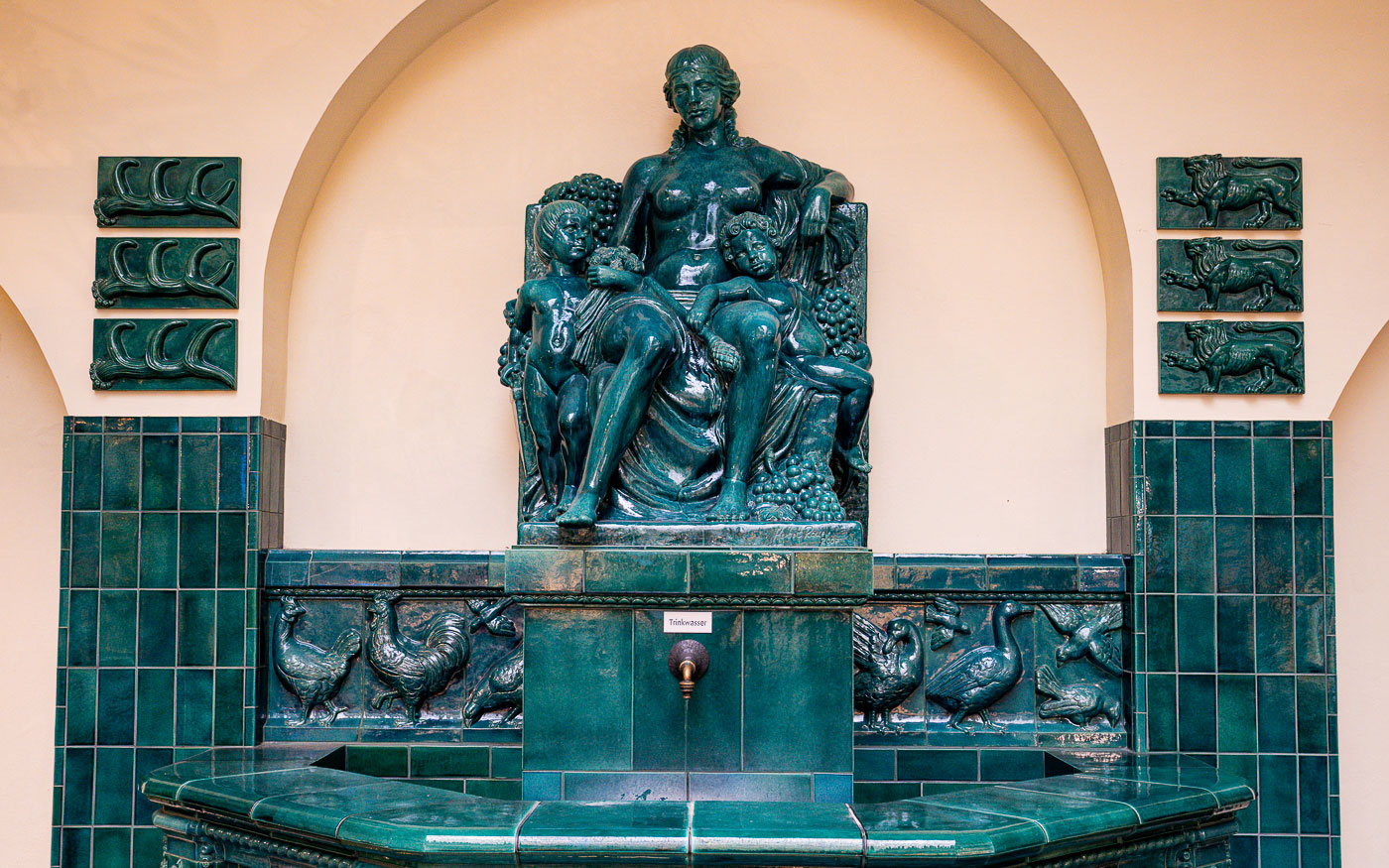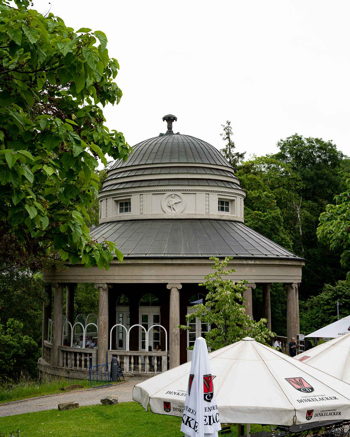 Danach weiter Richtung Teehaus im Weißenburgpark. Nach einem kurzen Spaziergang mit Anstieg entfaltet sich der Blick auf diesen eindrucksvollen Jugendstil-Pavillon mit großer Terrasse, Teich und Brunnen, direkt neben dem Marmorsaal mitsamt Gedenksäule. Errichtet wurde das Häuschen im Jahre 1913 und war tatsächlich für Teezeremonien gedacht. Heute bekommt man hier nicht nur Getränke, sondern auch deftige Speisen wie zum Beispiel Linsen mit Spätzle und Saitenwürstle.