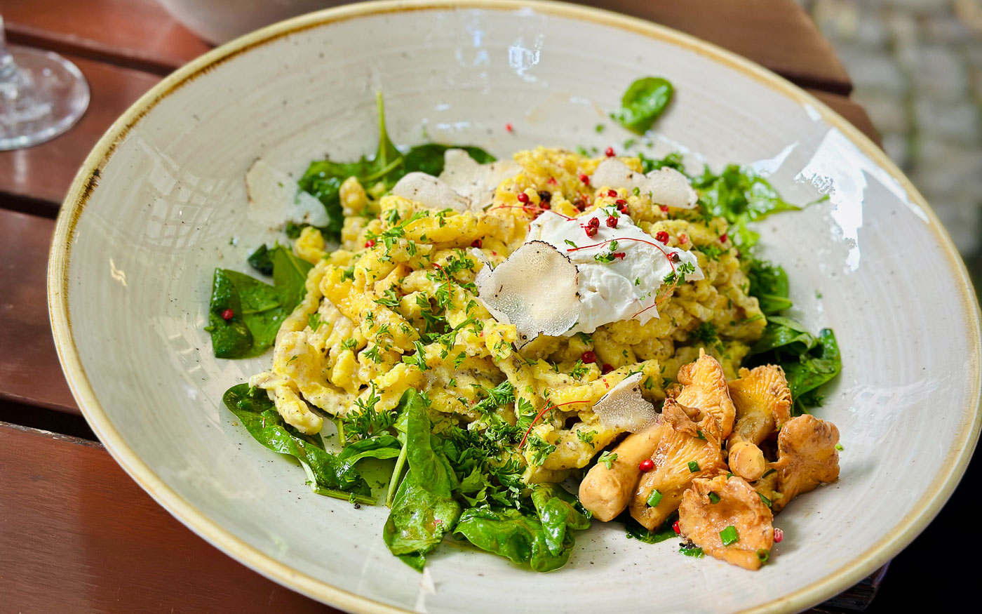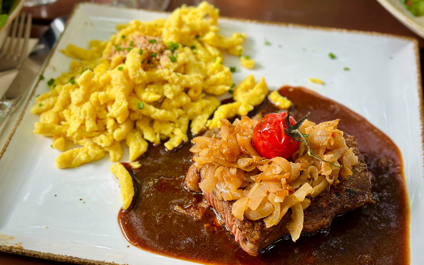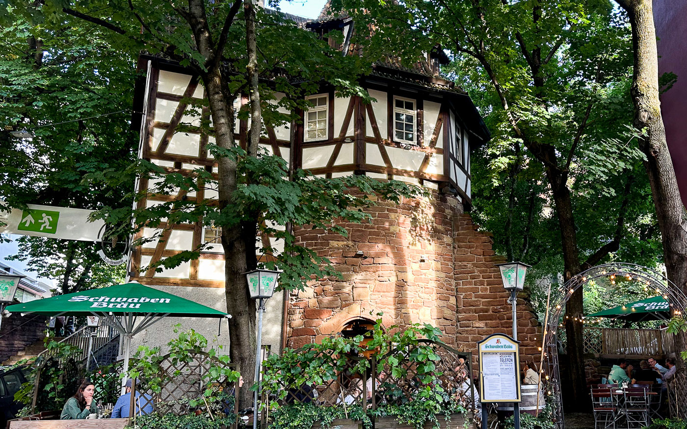 … spätestens jetzt sollte sich nicht nur der Schrittzähler, sondern auch der Magen bemerkbar machen. Hervorragenden Zwiebelrostbraten und Trüffel-Spätzle (!) gibt’s im 1564 erbauten „Schellenturm“ im Bohnenviertel, etwa fünfzehn Gehminuten vom Schlossplatz entfernt.