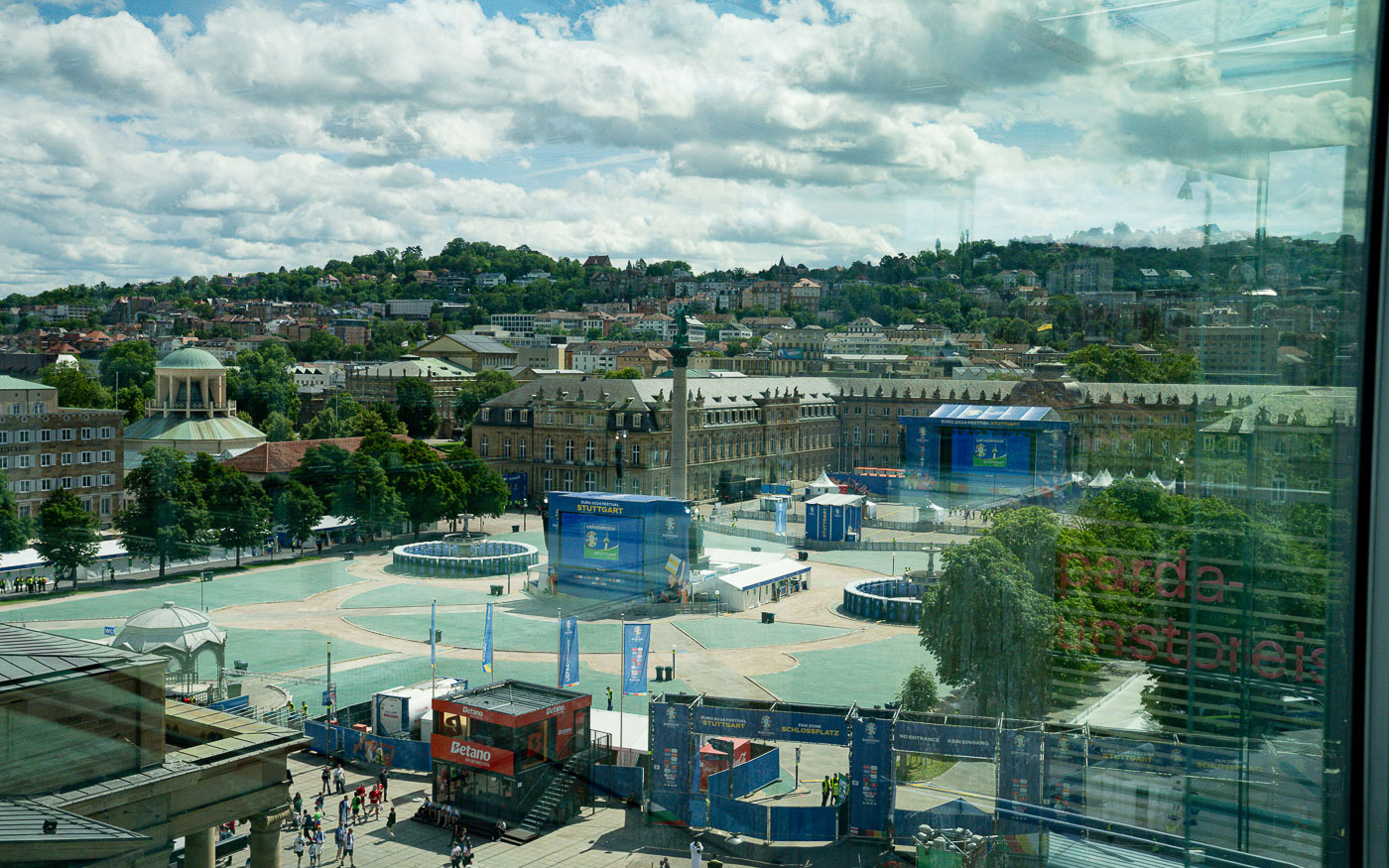 Eine der schönsten Orte in Stuttgarts Innenstadt ist der Schlossplatz. Ursprünglich ein schnöder Parade‐ und Exerzierplatz wurde das Gelände vor dem Neuen Schloss Ende des 19. Jahrhunderts in einen Blumengarten umgewandelt. Zu meiner Zeit war hier gerade eine große Fan-Zone der Fußball-EM 2024 aufgebaut – Stuttgart als Host-City –, aber zu jeder anderen Zeit des Jahres lädt dieser Platz zum Erholen ein.