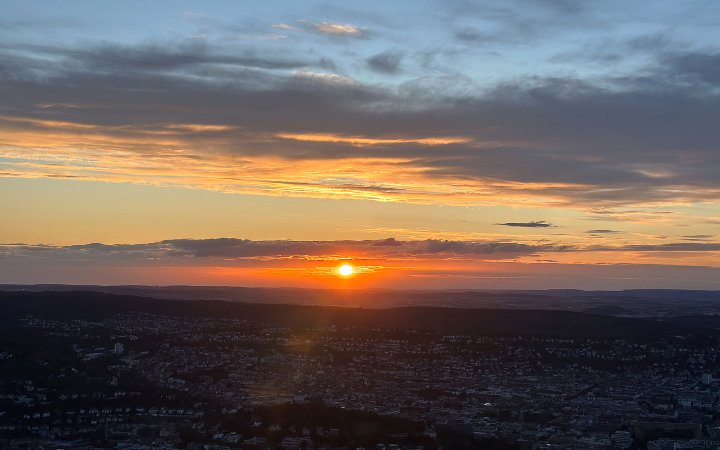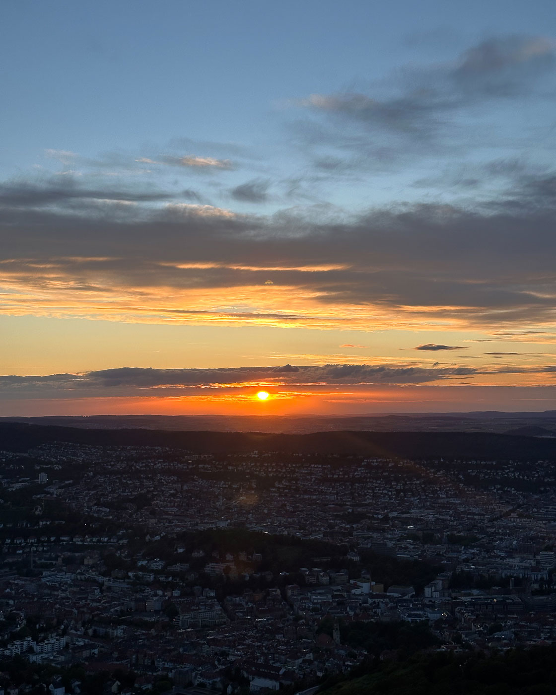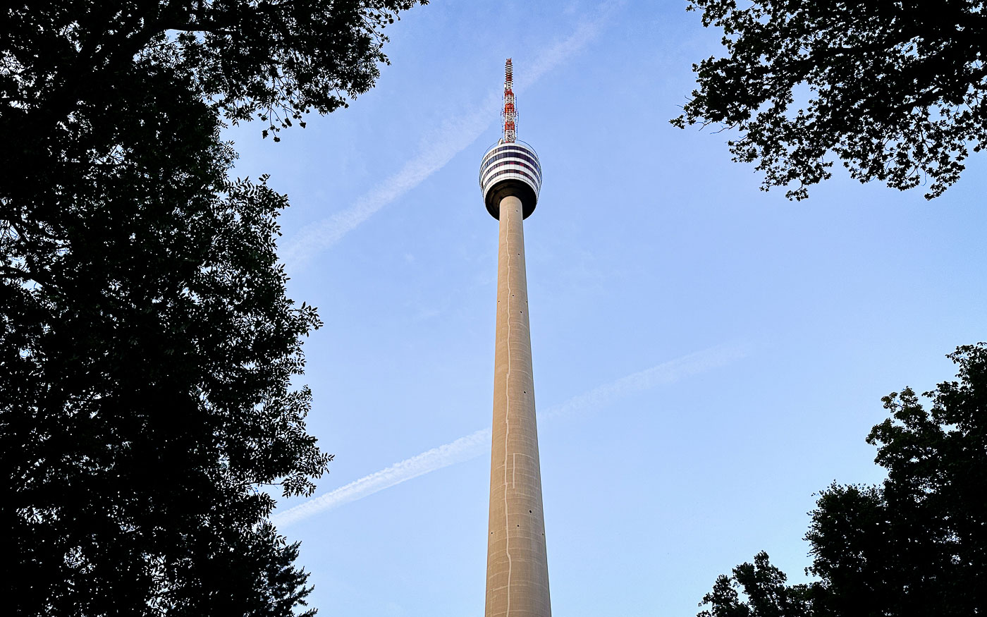 Den Sonnenuntergang erlebt man am eindrucksvollsten im SWR Fernsehturm. Bis dahin kann man zwar durchaus in etwa 60-80 Minuten zu Fuß gehen, wer allerdings – wie ich immer – stetig mit einem engen Zeitkorsett durch die Gegend läuft, würde ich eher raten, die Bahn zu besteigen; Stuttgart ist nämlich infrastrukturell sehr gut vernetzt, man kommt eigentlich überall schnell mit Bus, Tram oder Bahn hin. Der Turm wurde vor etwa 60 Jahren erbaut und bietet auf 150 Metern einen tollen Blick auf die Stadt und den Sonnenuntergang.