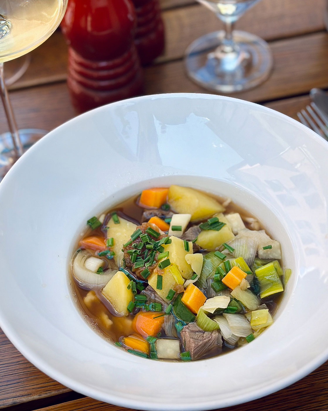 Nur wenige Meter entfernt lädt die „TA OS Weinbar“ zum Verschnaufen ein. Und wer sich nicht bereits in der Markthalle vollgestopft hat, findet hier allerlei Schwäbisches zum Verzehr. Gänzlich unbekannt war mir der „Gaisburger Marsch“, ein deftiger Rinder-Kartoffeleintopf mit Spätzle-Einlage.