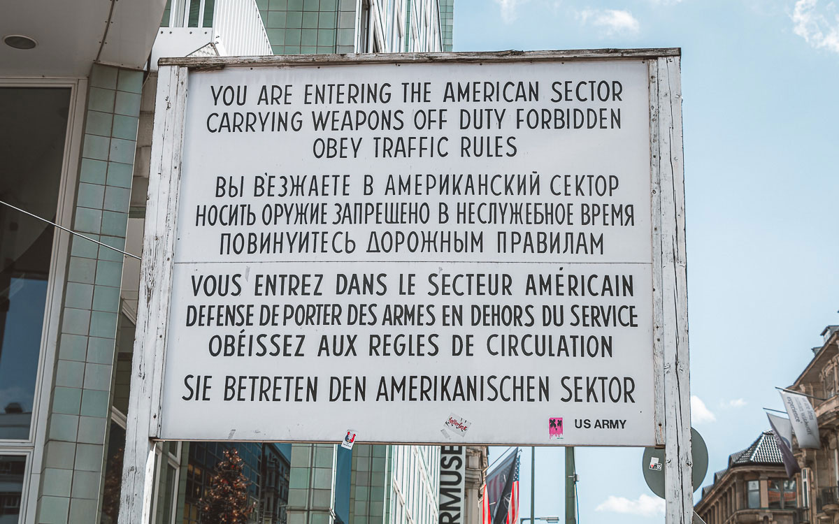Der einst wichtigste Grenzübergang zwischen Ost- und West-Berlin, Checkpoint Charlie, ist einer der touristischsten Orte in Berlin. Die Mauer ist hier mittlerweile verschwunden, jedoch zeigt eine farbige Linie, wo diese früher verlief.