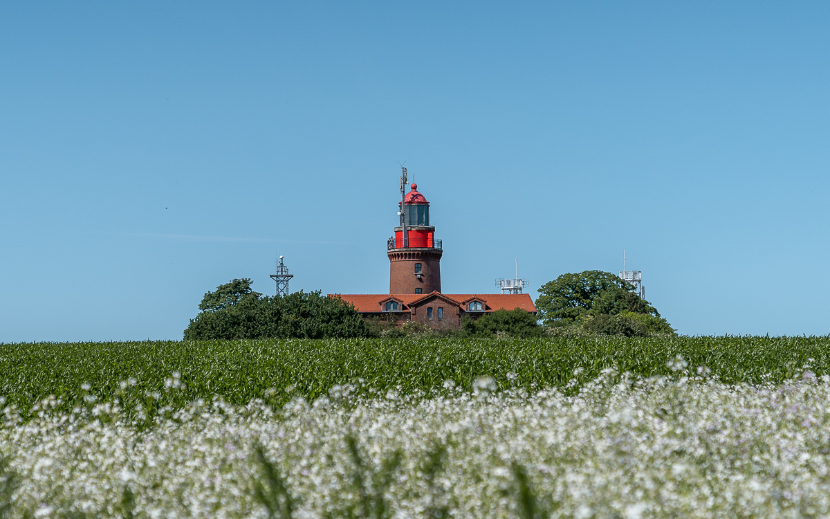 Von allen Leuchttürmen liegt dieser an der deutschen Ostseeküste am höchsten über dem Meer. Dabei ist er sehr klein. Winzig. Radelst du nach Bastorf brauchst du kein Navi, denn den Leuchtturm siehst du von weitem hinter den Felden thronen.