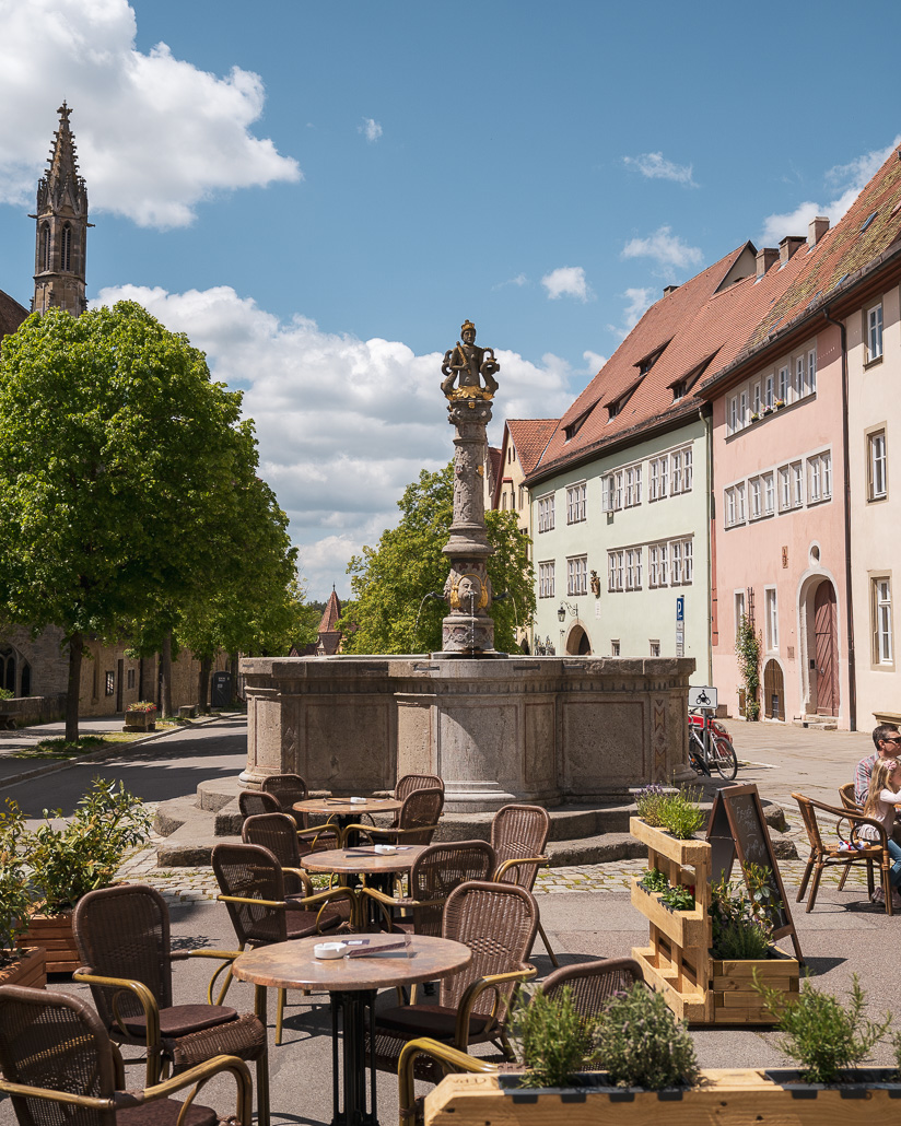Wie einst bildet der von prachtvollen Bürgerhäusern gesäumte Marktplatz, Kreuzungspunkt zweier historischer Fernhandelsstraßen, den Mittelpunkt der Stadt. Heute treffen hier Einheimische auf dem Wochenmarkt auf Touristen. Hier rund um den Marktplatz findest du einige architektonische Perlen und den größten Brunnen in Rothenburg.