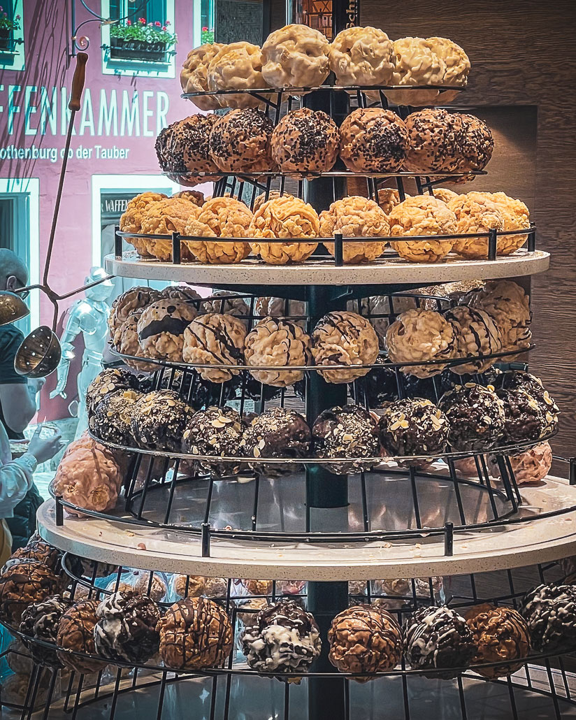 Im ganzen Taubertal (nicht nur in Rothenburg) gibt es eine Spezialität: Schneeballen. Die heißen genauso, da sie die Größe und Form eines runden Schneeballen besitzen. Daher findest du in der Altstadt überall Bäckereien, die diese Spezialität im Schaufenster platzieren.
