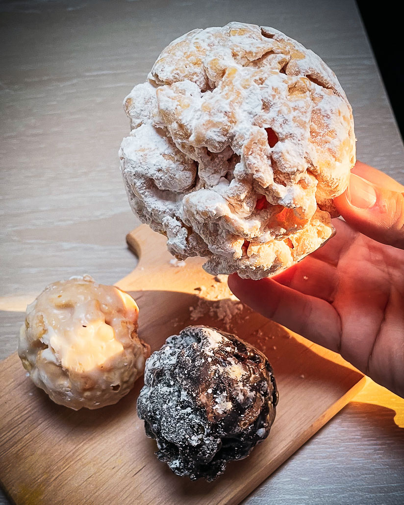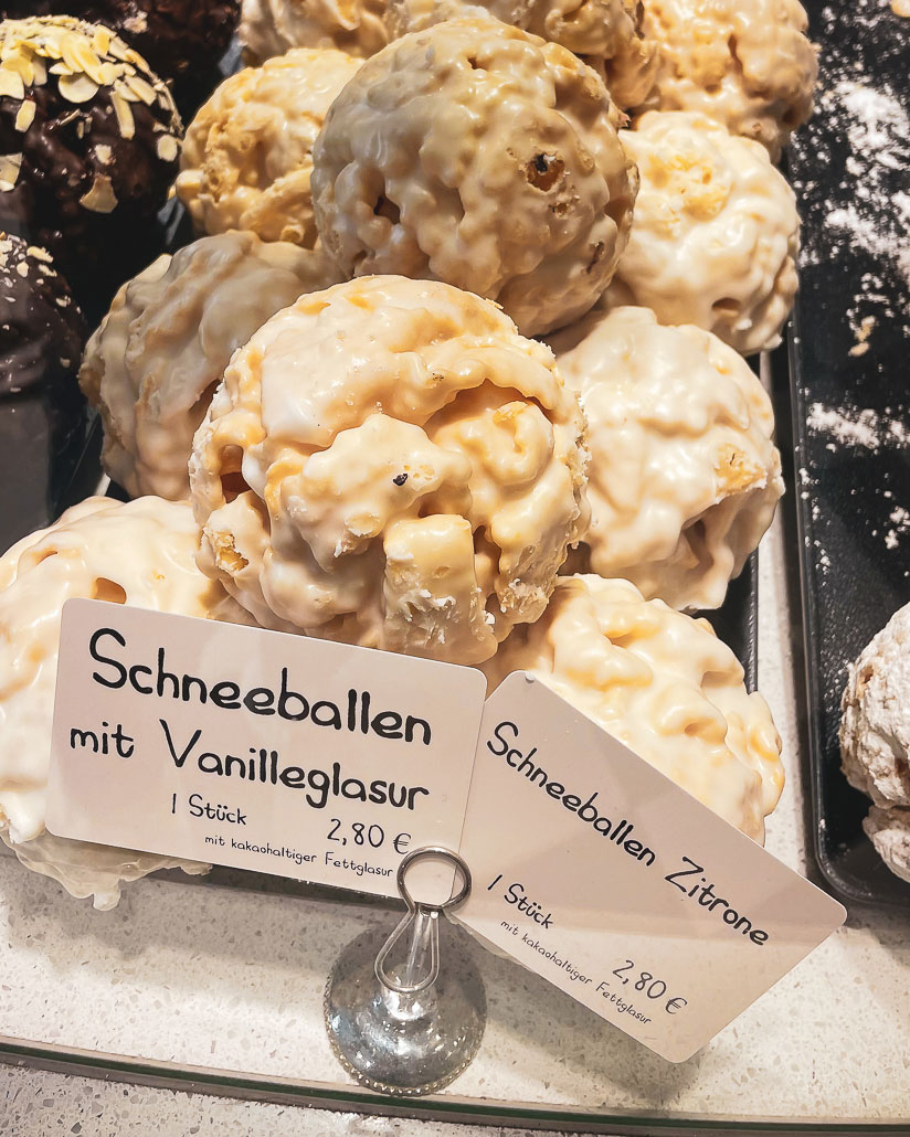 Der Schneeballen ist aus Mürbteig, mit Puderzucker bestäubt. Es gibt allerdings auch Variationen mit Schokolade, Zitronenglasur, weißer Schokolade und ein paar mehr. In der Bäckerei Stiffler kannst du bei der gläsernen Produktion dem Konditor zusehen, wie er die Schneeballen herstellt.