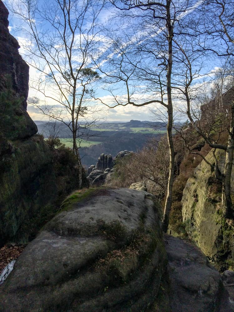 Eines der vielen Highlights in der Sächsischen Schweiz sind die zerklüftete Felswänden und der Blick in die Ferne