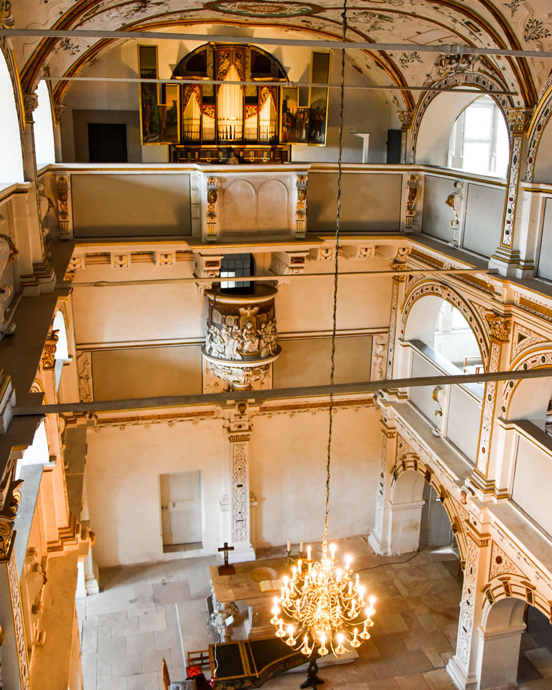 Besonders hübsch ist die Schlosskirche, die regelmäßig Konzerte veranstaltet. Im Zentrum der Aufmerksamkeit: eine der ältesten noch bespielbaren Renaissance-Orgeln aus Holz in Zentraleuropa. Wir hatten das Glück, dass der Organist sich bei unserem Besuch auf den Abend vorbereitete; ein Wahnsinnsklang!