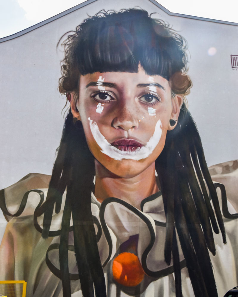 Eine andere Fassade zeigt eine Darstellerin des Films „The Day the Clown Cried“ von Jerry Lewis; dieser filmische Versuch, das Dasein eines Clowns in einem KZ festzuhalten, hat nie das Licht der Öffentlichkeit erblickt. Umso wichtiger, dass seine traurige Geschichte hier optisch festgehalten wird.