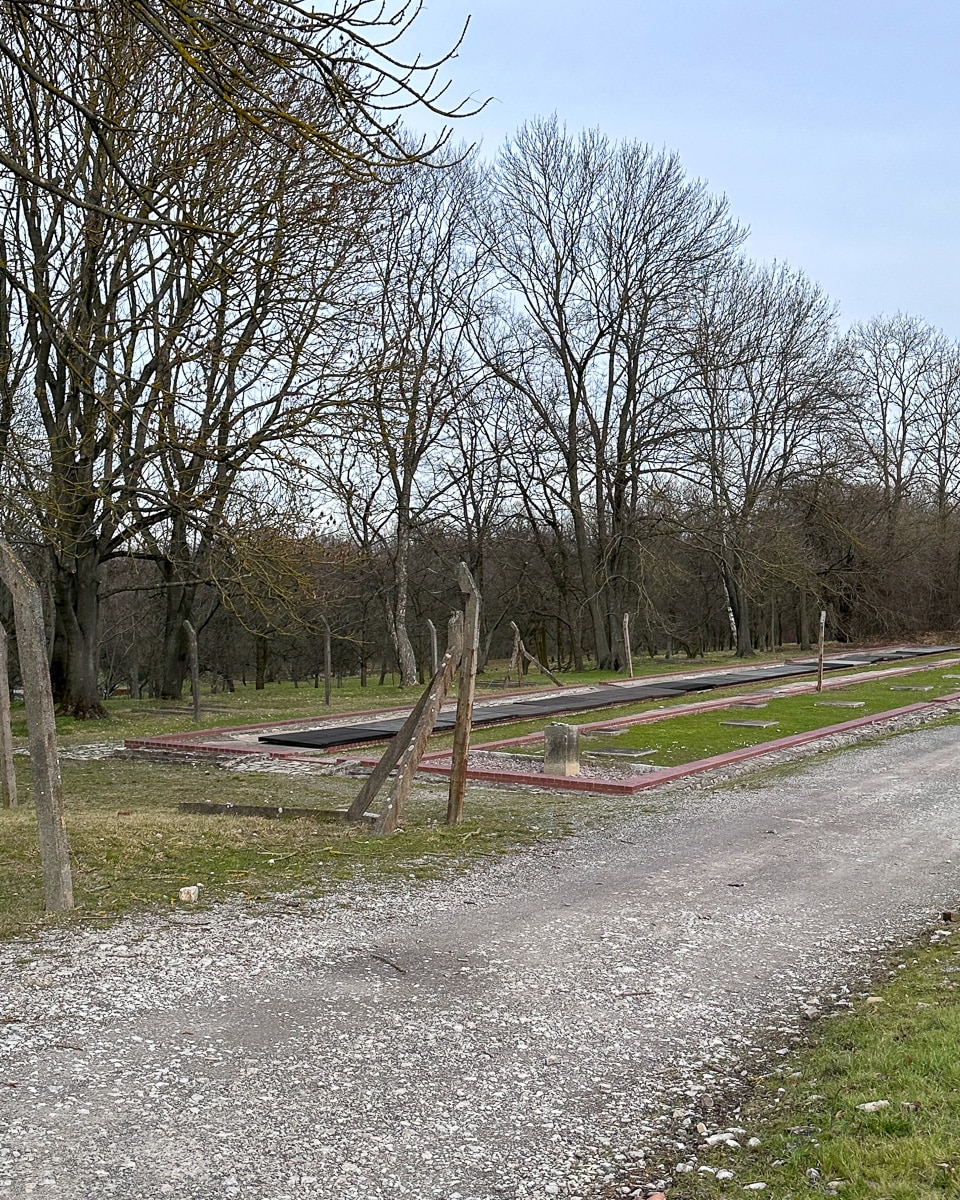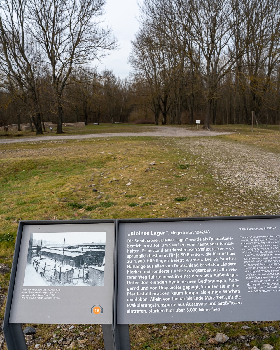 Nur Überreste der Latrine kannst du heute noch vor Ort erkunden. Im kleinen Lager, dem Quarantänebereich, wurden innerhalb kürzester Zeit 12 fensterlose und 40 Meter lange und 10 Meter breite Pferdeställe erbaut. Die ursprünglich für je 50 Pferde vorgesehenen Ställe wurden schnell für Menschen genutzt. In diesen mussten 1000 bis 2000 Menschen in pritschenartigen Regalen aus 4 Lagen Platz finden.