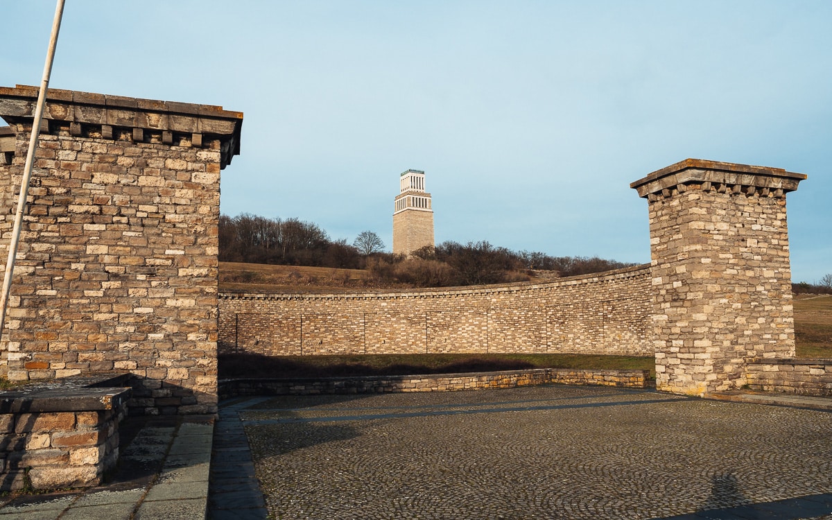 Du beginnst deinen Rundgang am Parkplatz mit dem Abstieg zu Massengräbern. Entlang des Ettersberges und hinauf zum Feierplatz und dem 50 Meter hohen Glockenturm, der 1958 im Zentrum des Geländes erbaut wurde. Die Glocke hat ein Gewicht von 11 Tonnen, die jedes Jahr am 27. Januar, dem Tag der Befreiung des Konzentrationslagers, geläutet wird. Ich weiß nicht, warum sie während meines Besuchs erklang, wenn dem so ist (leider war ich allein unterwegs und konnte niemanden fragen).
