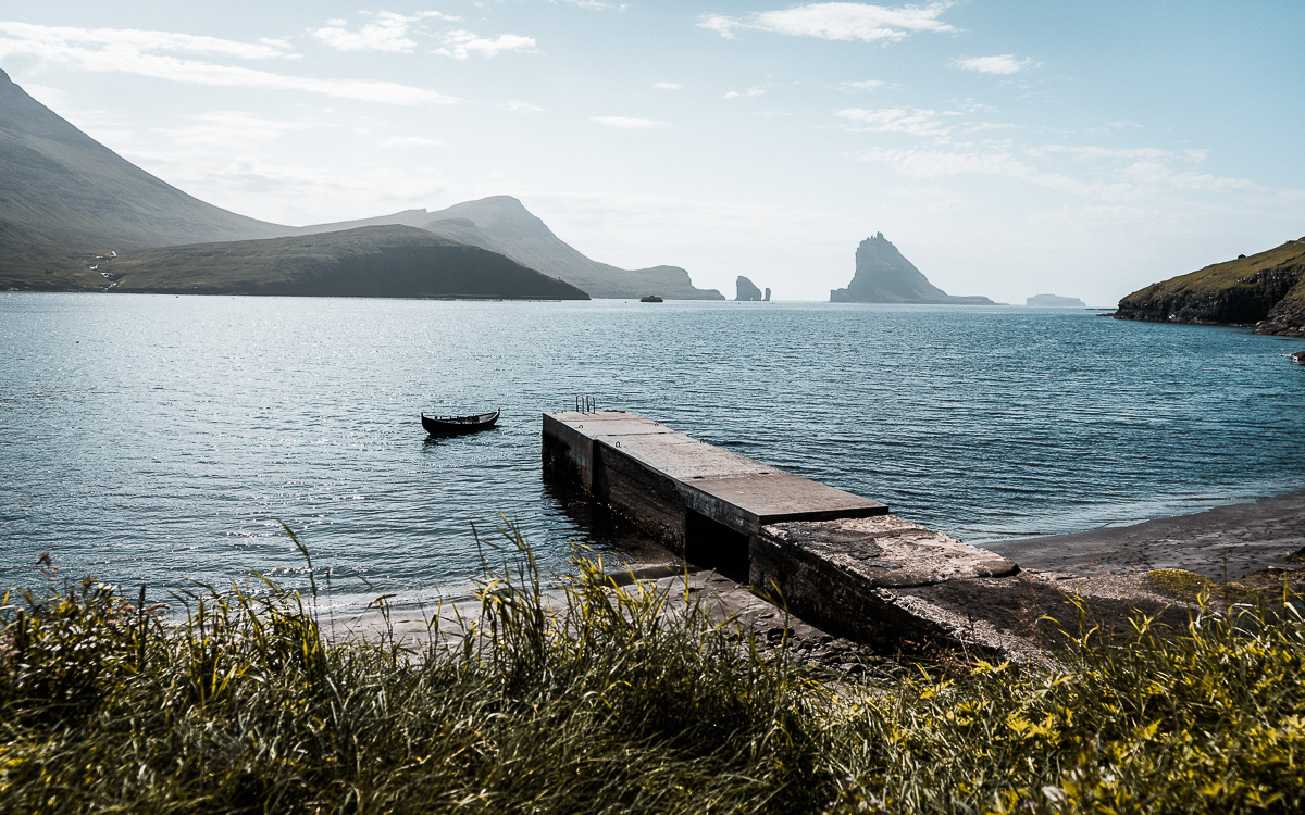 Vielleicht liegt dies auch am Ausblick auf die markanten Felsen von Tindhólmur und Dragarnir. Bei gutem Wetter – wir haben solch einen Tag erwischt – kannst du bis nach Mykines sehen. Wir lassen das Auto stehen und wandern zu Fuß durch die kleinen Gässchen von Bøur. Entlang des kleinen Bachs und der kleinen Kirche. Immer im Blick: Das Meer! Am Strand liegen die Einheimischen und baden im 9 Grad kalten Wasser. Bei 24 Grad ein überdurchschnittlicher Sommertag!